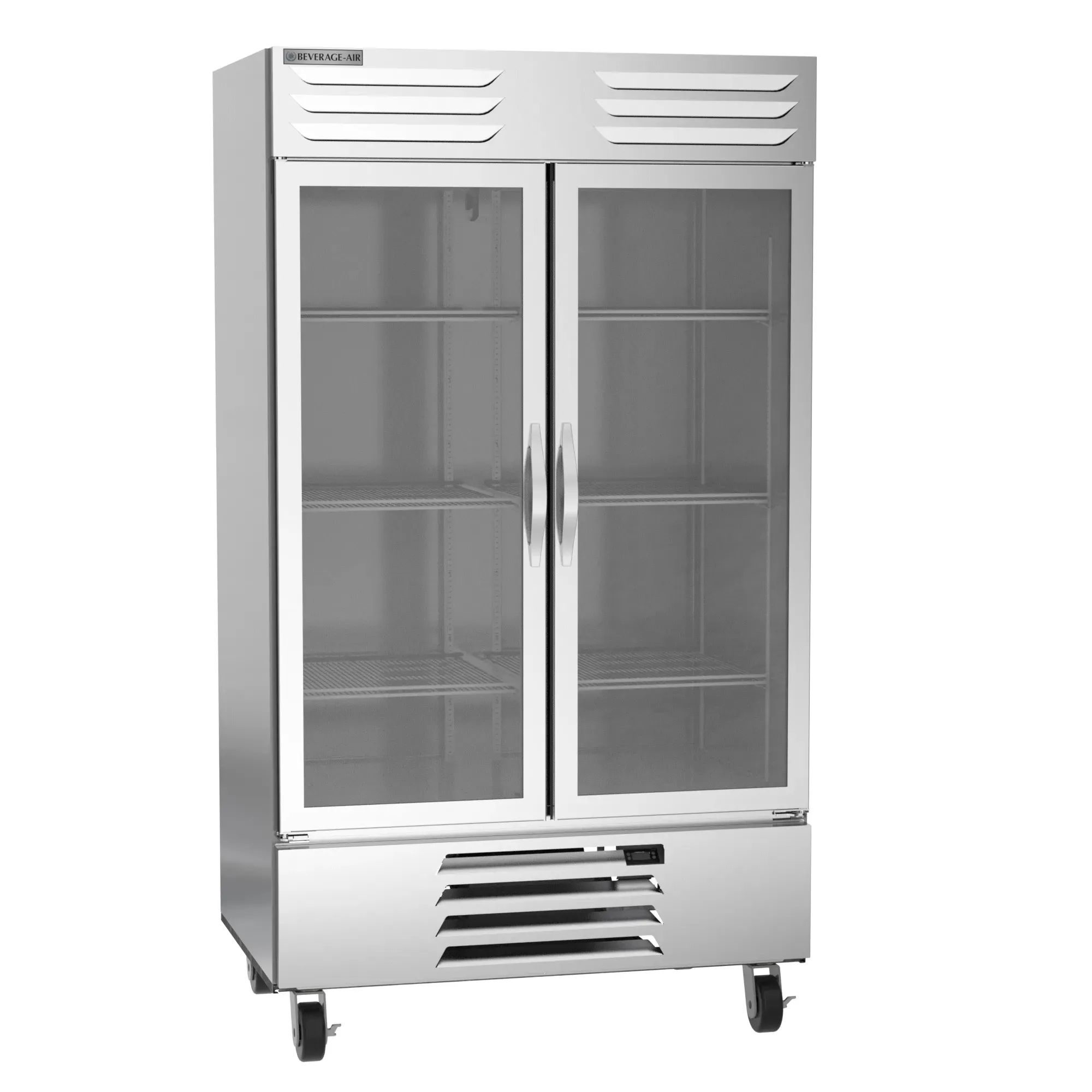 Unleash gastronomic brilliance with the Beverage Air RB44HC-1G Refrigerator, Reach-In. This top-of-the-line refrigerator is designed to meet the demanding needs of commercial restaurants. With a spacious 44 cu. ft. capacity, it provides ample storage space for all your perishable ingredients. The two-section design features two hinged glass doors, allowing you to easily see and access your items. Inside, you'll find six adjustable shelves, providing flexibility to accommodate items of various sizes. The LED interior lighting illuminates the contents, making it easy to locate what you need. The aluminum interior and stainless steel front ensure durability and easy cleaning, while the gray coated steel sides add a sleek touch. The bottom-mounted self-contained refrigeration system is not only efficient but also helps save valuable kitchen space. This refrigerator uses R290 Hydrocarbon refrigerant, which is environmentally friendly. With its 1/3 HP motor, this refrigerator is powerful and reliable. It is cULus, UL EPH Classified, and UL-Sanitation certified, guaranteeing its safety and quality. Made in the USA by Beverage Air, a trusted name in refrigeration, this RB44HC-1G Refrigerator, Reach-In is the perfect addition to any commercial restaurant.