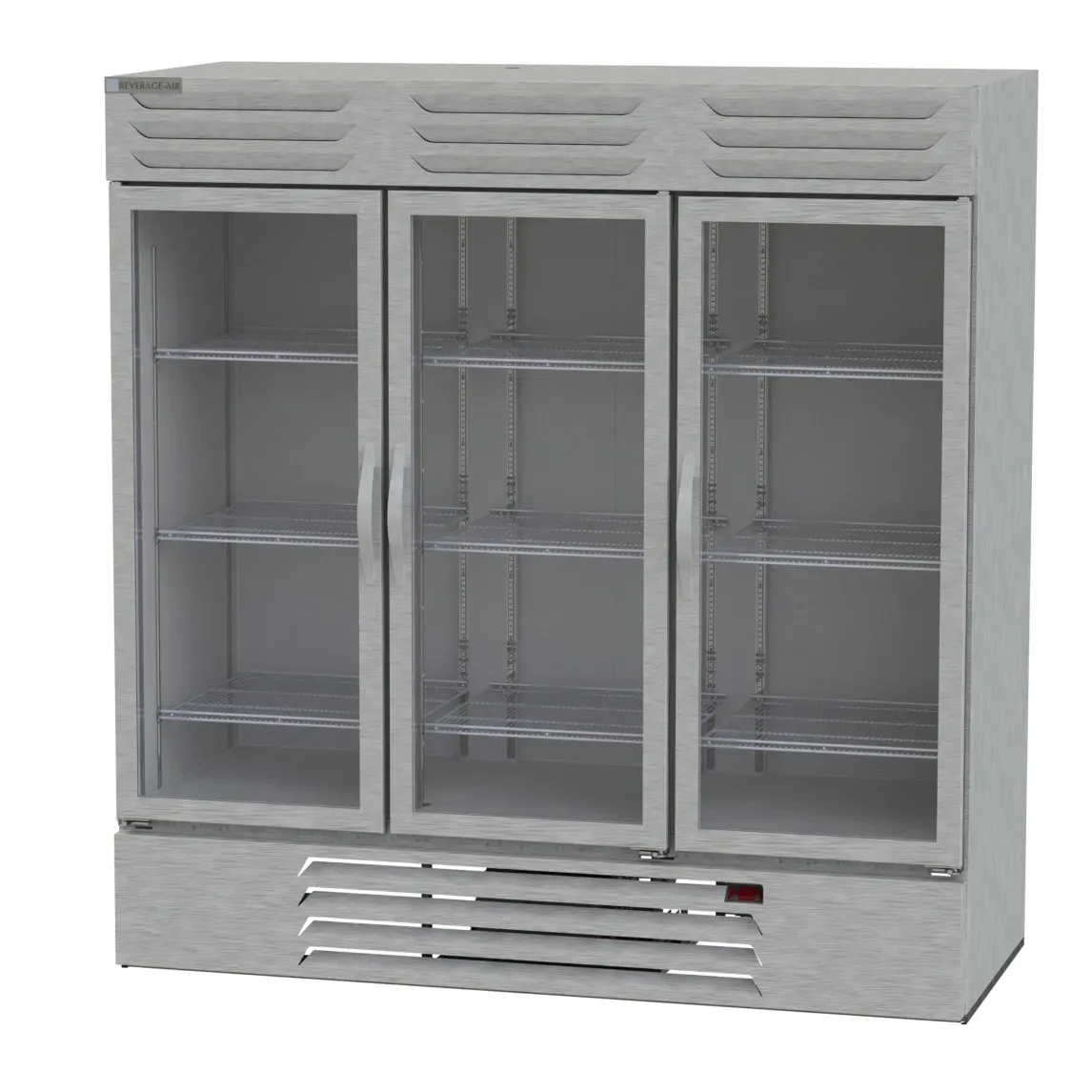Equip your commercial kitchen with the Beverage Air RB72HC-1G Refrigerator, Reach-In. This three-section refrigerator offers a spacious 68.93 cu. ft. capacity, perfect for storing a large quantity of food and beverages. With nine adjustable shelves, you can easily customize the interior to accommodate your specific needs. The lockable hinged door ensures the safety and security of your perishable items. The gray coated steel sides and stainless steel front not only provide durability but also give the refrigerator a sleek and professional look. The three glass doors allow for easy visibility and access to the contents inside. The LED interior lighting illuminates the interior, making it easy to locate items even in low-light conditions. The aluminum interior is easy to clean and maintain. With bottom-mounted self-contained refrigeration and R290 Hydrocarbon refrigerant, this refrigerator is energy-efficient and environmentally friendly. The 1/2 HP compressor ensures reliable performance. This refrigerator is cULus, UL EPH Classified, and UL-Sanitation certified, guaranteeing its quality and safety. Made in the USA, the Beverage Air RB72HC-1G Refrigerator, Reach-In is the perfect addition to any commercial restaurant.