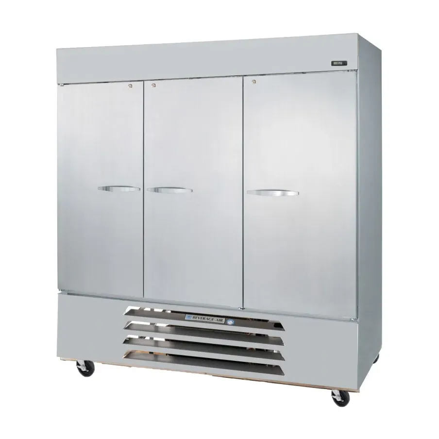 Realize kitchen dreams with the Beverage Air RB72HC-1S Refrigerator, Reach-In. This top-of-the-line refrigerator is designed to meet the needs of commercial restaurants, offering a spacious 68.93 cu. ft. capacity to store all your perishable ingredients and beverages. With its three-section design and nine wire shelves, you'll have plenty of room to organize and access your items with ease. The lockable hinged self-closing solid doors ensure the freshness and safety of your products, while the LED lighting illuminates the interior for easy visibility. Made in the USA, this refrigerator features a stainless steel front and gray coated steel sides for durability and a sleek appearance. The bottom-mounted self-contained refrigeration system, powered by the eco-friendly R290 Hydrocarbon refrigerant and 1/2 HP compressor, ensures efficient cooling and reduced energy consumption. Trust Beverage Air to deliver reliable refrigeration solutions for your commercial kitchen.