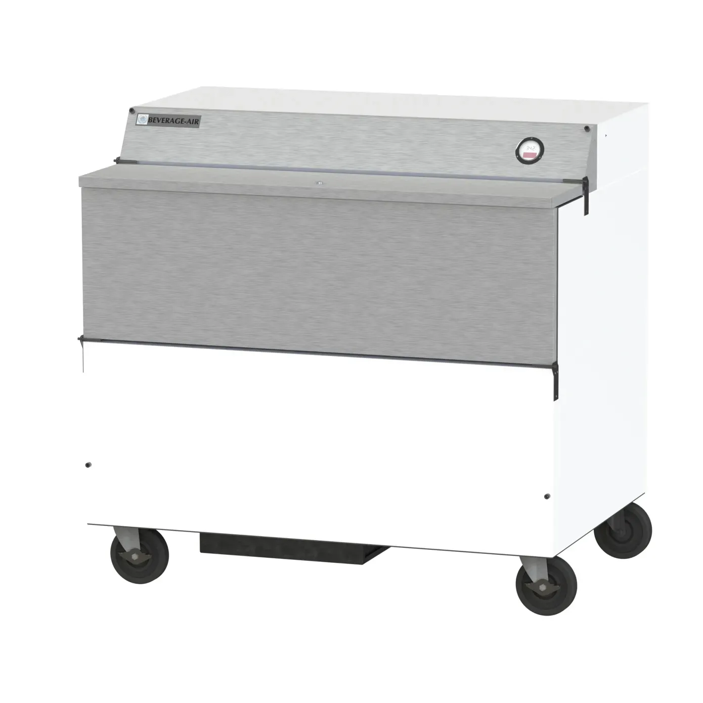 Cook with precision using the Beverage Air SMF49HC-1-W Milk Cooler / Station. This school milk cooler is designed to meet the needs of commercial restaurants, ensuring that your milk stays fresh and at the perfect temperature. With a capacity of 19.66 cu. ft., this cooler can hold either (12) 13" x 13" x 11" cases or (8) 19" x 13" x 11" cases, providing ample space for your milk storage needs. The exterior digital thermometer allows you to easily monitor the temperature, while the self-latching doors/lids with safety bumpers ensure that your milk is securely stored. The galvanized steel interior with a stainless steel floor is durable and easy to clean, making maintenance a breeze. Additionally, the R290 Hydrocarbon refrigerant and electronic control provide efficient cooling and precise temperature control. Trust in the quality and reliability of Beverage Air, a trusted name in commercial refrigeration.