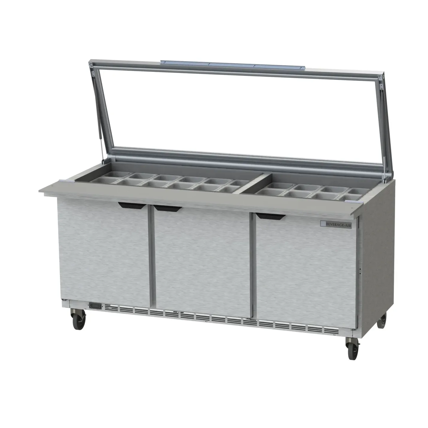 Deliver food perfection with the Beverage Air, SPE72HC-30M-STL Refrigerated Counter, Mega Top Sandwich / Salad Unit. This three-section counter is designed to meet the demands of a busy commercial restaurant. With a spacious 72" width and a 20.02 cu. ft. capacity, it offers ample storage for all your ingredients. The stainless steel top features an opening for 30 1/6 size pans, allowing for easy access and organization. The unit also includes a 10" cutting board for convenient food preparation. With three doors and six shelves, you can easily store and retrieve items as needed. The rear-mounted self-contained refrigeration system ensures optimal cooling performance, while the R290 Hydrocarbon refrigerant is both eco-friendly and energy-efficient. Made in the USA and certified by cULus and UL-Sanitation, this Mega Top Sandwich / Salad Unit is a reliable and durable addition to any commercial kitchen.