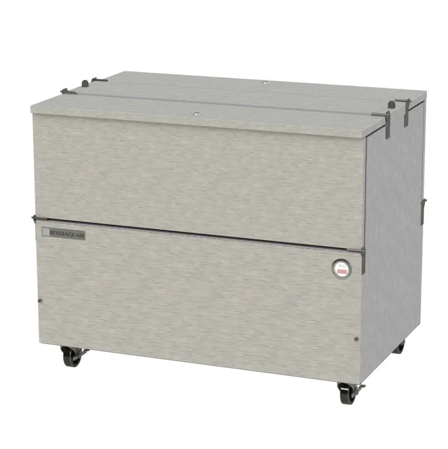 Introducing the Beverage Air ST58HC-S Milk Cooler / Station, a must-have for any commercial restaurant looking to dominate the culinary world. This School Milk Cooler is designed to meet the needs of busy establishments, with its spacious 22.5 cu. ft. capacity and dual access feature. The flat top carton capacities allow for easy organization, accommodating either (16) 13" x 13" x 11" or (10) 19" x 13" x 11" cases. The self-latching doors/lids with safety bumpers ensure secure storage, while the cylinder lock provides added security. The stainless steel interior and exterior not only give this cooler a sleek and professional look but also make it easy to clean and maintain. With electronic control and auto defrost, this cooler offers convenience and efficiency. Plus, it uses R290 Hydrocarbon refrigerant, making it environmentally friendly. Trust Beverage Air, a reputable vendor known for their high-quality products. Don't miss out on this essential addition to your commercial kitchen.