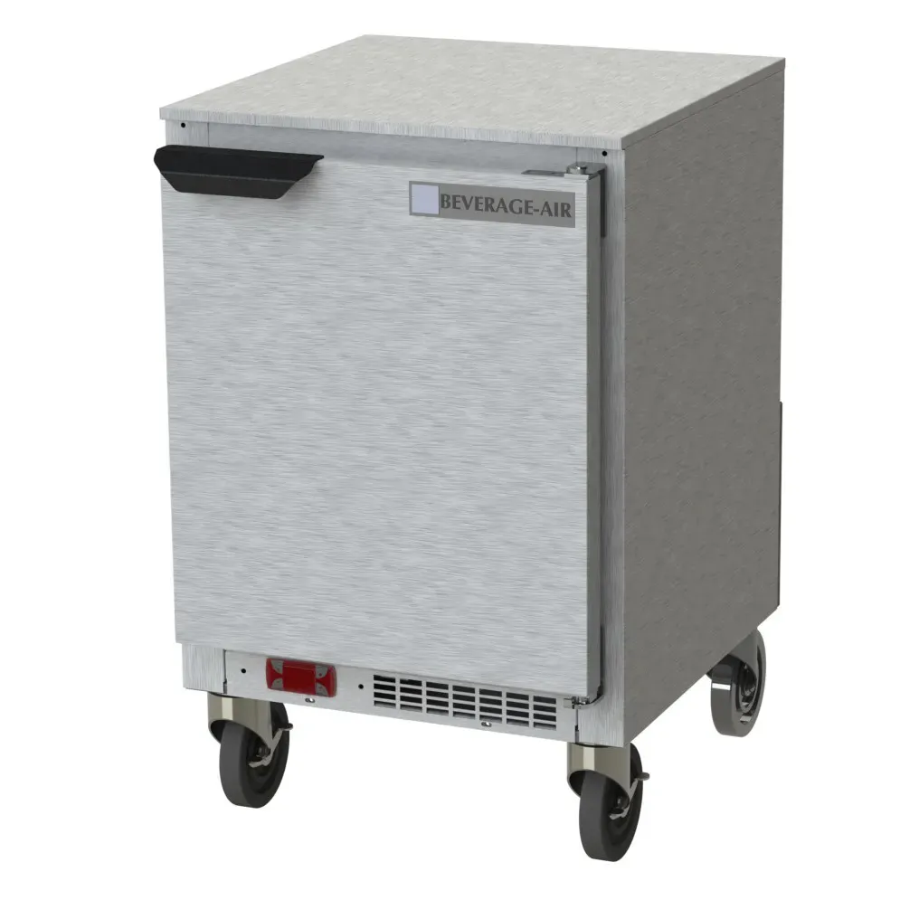 Unleash your inner chef with the Beverage Air UCF20HC Undercounter Freezer. This one-section freezer is designed to meet the needs of commercial restaurants, offering a shallow depth of 20" and a spacious 2.34 cu. ft. capacity. The stainless steel top with turned down edges provides a durable and easy-to-clean surface, while the stainless steel exterior ensures long-lasting performance. With a rear-mounted self-contained refrigeration system and R290 Hydrocarbon refrigerant, this freezer is both efficient and environmentally friendly. The UCF20HC also features two shelves for organized storage and a single door for easy access to your frozen ingredients. Made in the USA and certified by cULus, UL EPH Classified, and UL-Sanitation, this Beverage Air freezer is a reliable and high-quality addition to any commercial kitchen. Upgrade your restaurant's storage capabilities with the UCF20HC Undercounter Freezer.