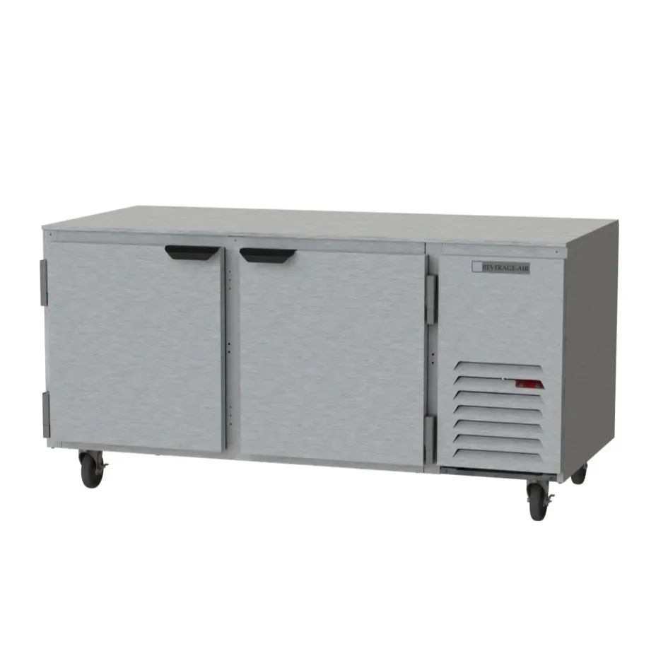 Transform your food service with the Beverage Air UCF67AHC Undercounter Freezer. This two-section freezer is designed to meet the demands of a busy commercial restaurant. With a spacious 67" width and 20.08 cu. ft. capacity, it provides ample storage space for your frozen goods. The electronic control ensures precise temperature management, while the two hinged self-closing solid doors make accessing your items quick and convenient. Inside, you'll find four wire shelves that can be adjusted to accommodate different-sized products. The stainless steel exterior not only adds a sleek and professional look to your kitchen but also ensures durability and easy cleaning. The aluminum interior, galvanized back, and bottom further enhance the unit's longevity. Powered by a 3/4 HP self-contained refrigeration system, this freezer uses R290 Hydrocarbon refrigerant, making it energy-efficient and environmentally friendly. With cULus, UL EPH Classified, and UL-Sanitation certifications, you can trust in the quality and safety of this made in the USA product. Upgrade your restaurant's storage capabilities with the Beverage Air UCF67AHC Undercounter Freezer.