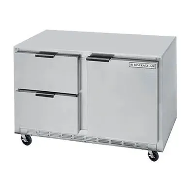 Cook with confidence and flair using the Beverage Air UCFD48AHC-2 Freezer. This undercounter reach-in freezer is designed to meet the demands of a commercial restaurant setting. With its two-section design and 13.9 cu. ft. capacity, it provides ample storage space for your frozen ingredients and prepared dishes. The unit features two drawers and one door, along with two shelves, allowing for easy organization and access to your items. The stainless steel exterior and top ensure durability and easy cleaning, while the aluminum interior provides excellent temperature retention. The rear-mounted self-contained refrigeration system, powered by a 1/2 HP compressor, ensures efficient cooling and maintains consistent temperatures. This freezer is also UL-Sanitation and UL EPH Classified, guaranteeing its safety and reliability. With the Beverage Air UCFD48AHC-2 Freezer, you can keep your ingredients fresh and easily accessible, making it a valuable addition to any commercial kitchen.