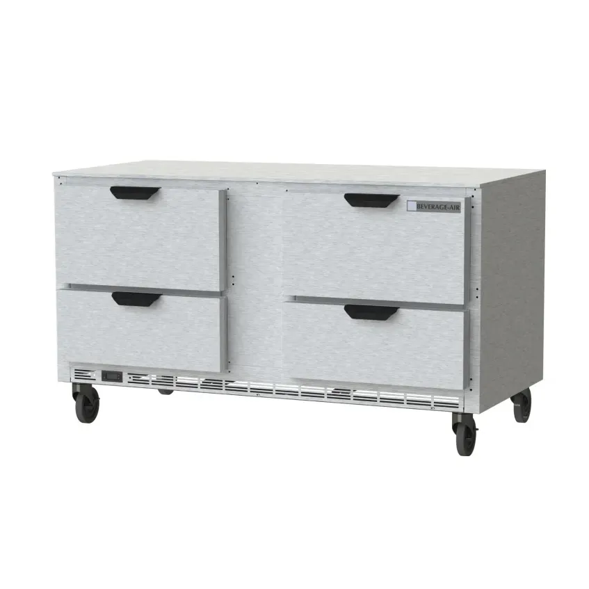 Fuel your restaurant's success with the Beverage Air UCFD60AHC-4 Undercounter Freezer. This two-section freezer is designed to meet the demands of a busy commercial kitchen. With a spacious 17.1 cu. ft. capacity and four drawers, you'll have plenty of room to store all your frozen ingredients and prepared dishes. The stainless steel exterior and top not only give this freezer a sleek and professional look but also make it durable and easy to clean. Inside, the aluminum interior ensures optimal temperature retention. The rear-mounted self-contained refrigeration system keeps your food consistently cold, while the R290 Hydrocarbon refrigerant is environmentally friendly. With a 1/3 HP compressor, this freezer is powerful enough to handle heavy use. Certified by cULus and UL-Sanitation, you can trust the quality and safety of this MADE IN USA product. Upgrade your kitchen with the Beverage Air UCFD60AHC-4 Undercounter Freezer and experience the convenience and efficiency it brings to your restaurant.
