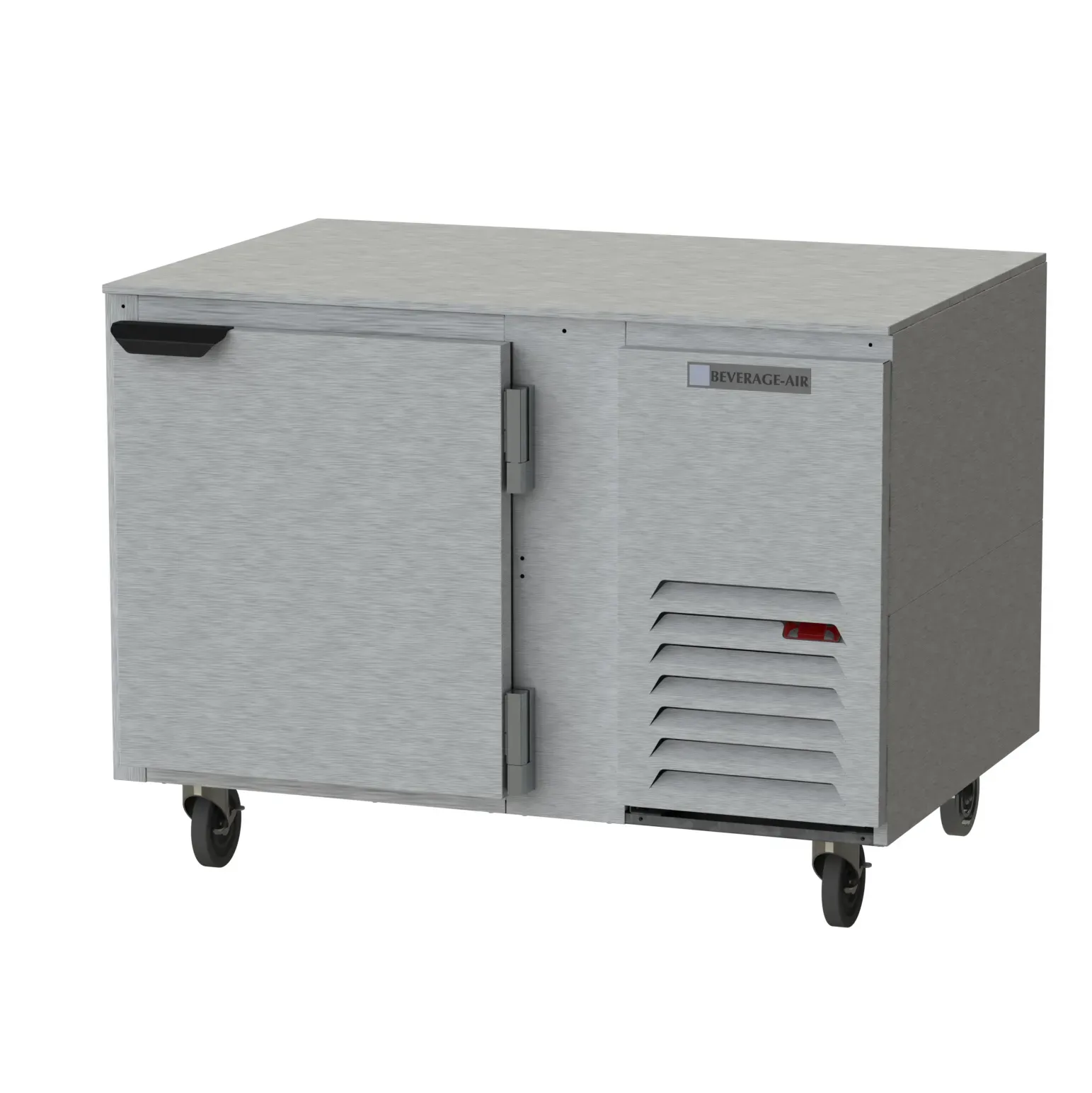 Introducing the Beverage Air UCR46AHC Undercounter Refrigerator, the perfect solution to simplify restaurant operations. This one-section refrigerator is designed to meet the needs of commercial restaurants, offering a spacious 10.8 cu. ft. capacity to store all your perishable ingredients and beverages. With its stainless steel exterior and top, this unit not only looks sleek but also ensures durability and easy cleaning. The aluminum interior provides excellent insulation and helps maintain optimal temperature levels. Equipped with a side-mounted self-contained refrigeration system and powered by a 1/4 HP compressor, this refrigerator delivers efficient cooling performance while minimizing noise and vibration. The UCR46AHC uses R290 Hydrocarbon refrigerant, which is environmentally friendly and energy-efficient. With one door and two shelves, organizing and accessing your items is a breeze. This undercounter refrigerator is cULus and UL EPH Classified, guaranteeing its safety and sanitation standards. Made in the USA by Beverage Air, a trusted name in the industry, the UCR46AHC is a reliable and essential addition to any commercial kitchen.