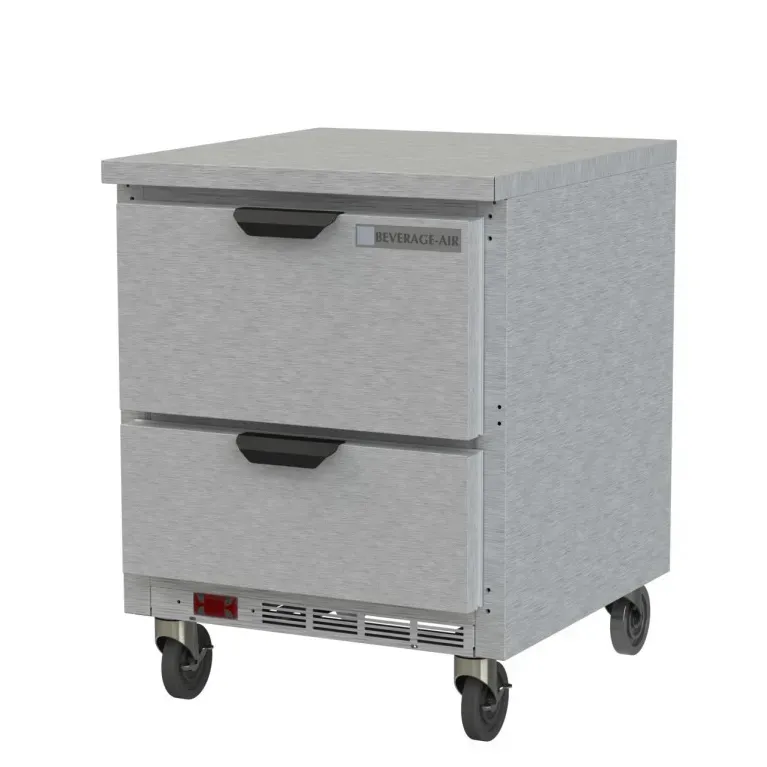 Equip your commercial kitchen with the Beverage Air WTFD27AHC-2-FLT Freezer Counter. This worktop freezer is designed to meet the demands of a busy restaurant environment. With a capacity of 6.13 cu. ft., it provides ample space to store your frozen ingredients and prepared dishes. The unit features two drawers, allowing for easy organization and access to your frozen goods. The stainless steel front and aluminum interior ensure durability and easy cleaning, while the 2-1/2" thick top and sides provide insulation to maintain optimal temperatures. The rear-mounted self-contained refrigeration system, powered by a 1/4 HP compressor, ensures efficient cooling. This freezer counter is also UL-Sanitation and UL EPH Classified, guaranteeing its safety and compliance with industry standards. Made in the USA, the Beverage Air WTFD27AHC-2-FLT is a reliable and high-quality addition to any commercial kitchen.