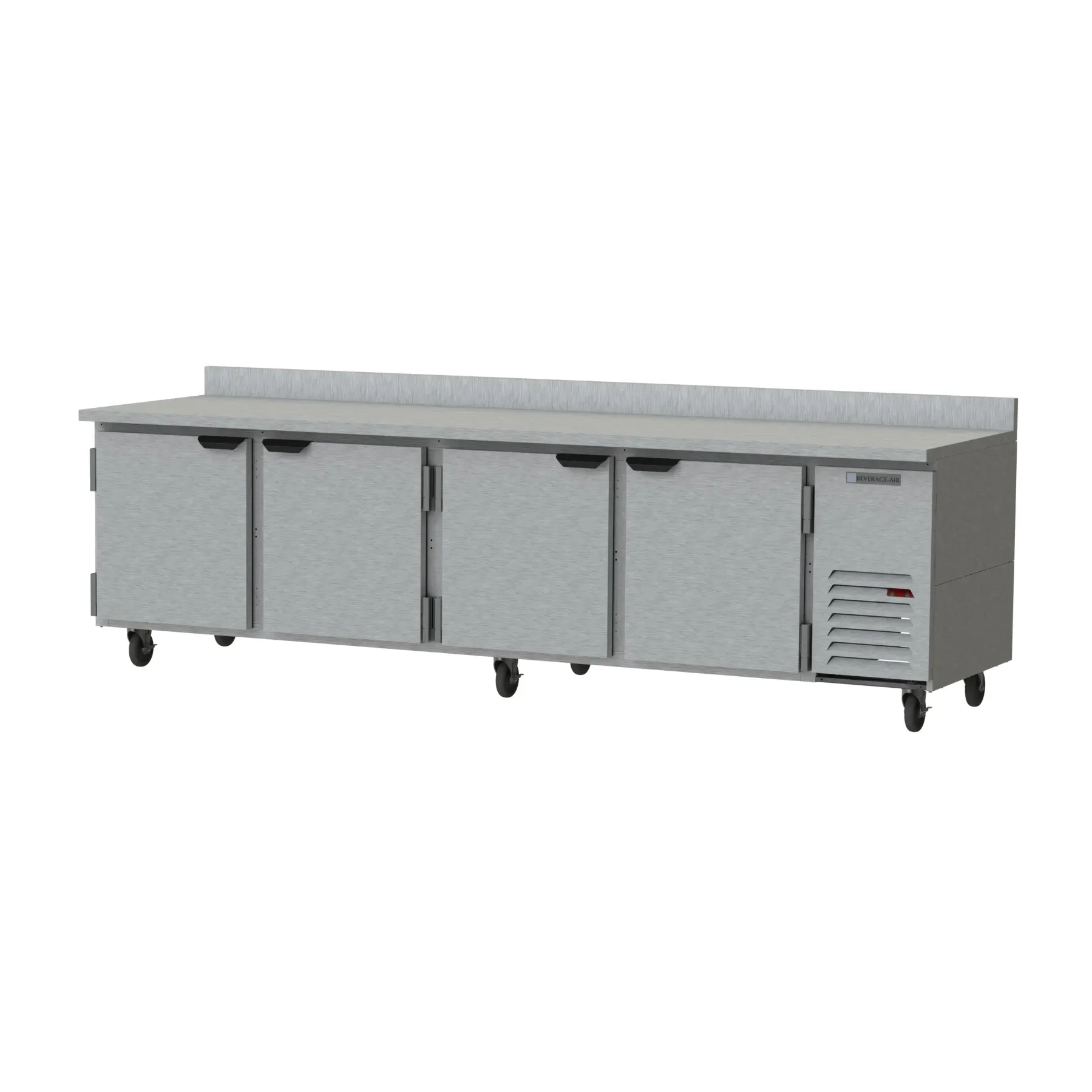 Craft culinary wonders with the Beverage Air WTR119AHC Refrigerated Counter. This four-section worktop refrigerator is designed to meet the demands of a busy commercial restaurant. With a spacious 119" width and 40.12 cu. ft. capacity, it provides ample storage for your ingredients and prepared dishes. The unit features four doors and eight shelves, allowing for easy organization and access to your items. The stainless steel front and aluminum interior ensure durability and easy cleaning, while the 2-1/2" thick top and sides provide excellent insulation. The built-in backsplash prevents spills and messes from reaching the wall. Powered by a 1/3 HP self-contained refrigeration system using R290 Hydrocarbon refrigerant, this unit is energy-efficient and environmentally friendly. With cULus, UL EPH Classified, and UL-Sanitation certifications, you can trust in the quality and safety of this made in the USA product. Upgrade your kitchen with the Beverage Air WTR119AHC Refrigerated Counter and experience the convenience and reliability it brings to your culinary creations.