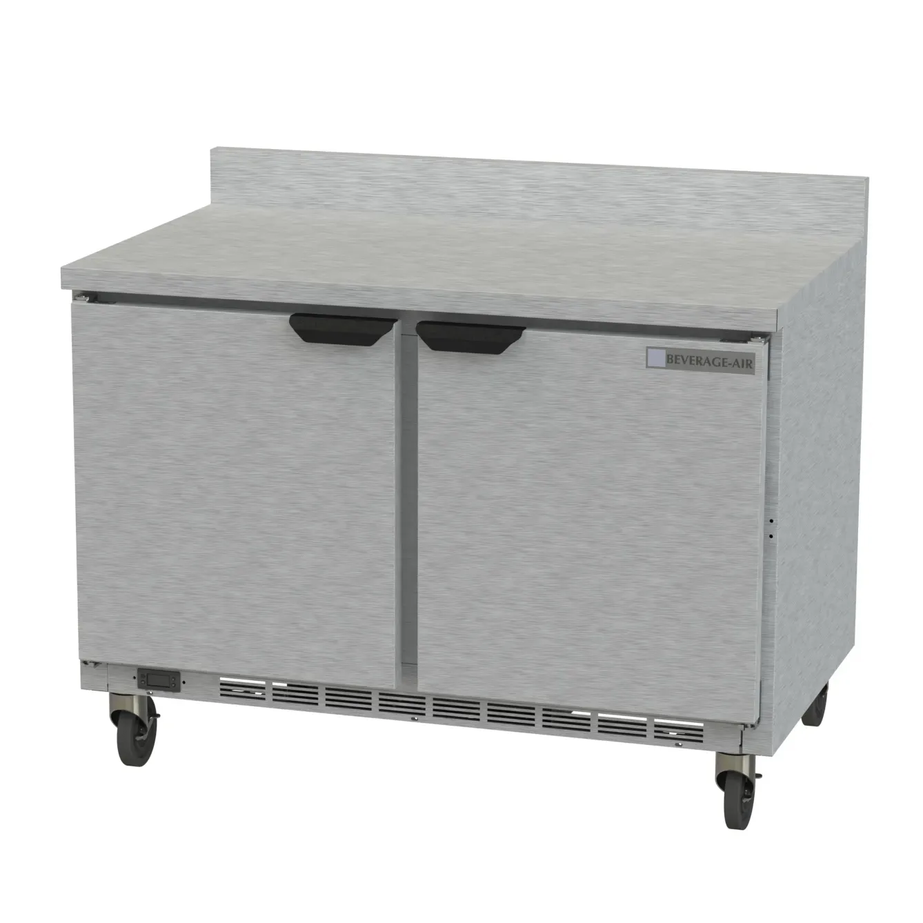 Culinary artistry redefined with Beverage Air's WTR48AHC-FIP Refrigerated Counter, Work Top. This two-section worktop refrigerator is designed to meet the demands of a busy commercial restaurant. With a spacious 48"W and 11.82 cu. ft. capacity, it provides ample storage for your ingredients and prepared dishes. The two solid doors and four shelves allow for easy organization and access to your items. The vertical thermometer ensures precise temperature control, while the stainless steel front and 2-1/2" thick top and sides provide durability and a sleek appearance. The aluminum interior and 4" foamed-in place backsplash make cleaning a breeze. Powered by rear-mounted self-contained refrigeration and using R290 Hydrocarbon refrigerant, this unit is energy-efficient and environmentally friendly. With its cULus, UL EPH Classified, and UL-Sanitation certifications, you can trust in its quality and safety. Upgrade your kitchen with the Beverage Air WTR48AHC-FIP and experience the perfect blend of functionality and style.