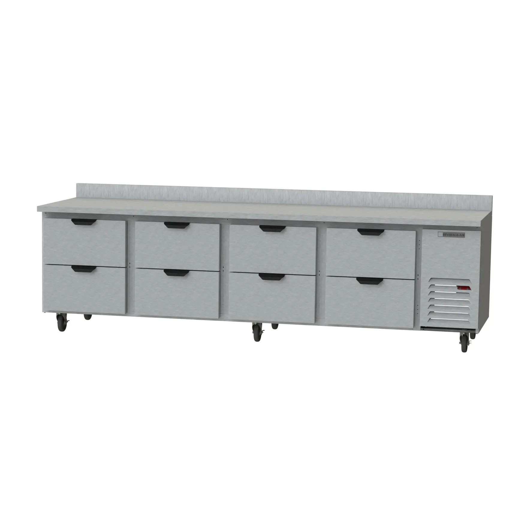 Master the art of cooking with the Beverage Air WTRD119AHC-8 Refrigerated Counter. This four-section worktop refrigerator is designed to meet the demands of a busy commercial restaurant. With a spacious 119"W and 40.12 cu. ft. capacity, it provides ample storage for all your ingredients. The unit features eight drawers, allowing for easy organization and access to your supplies. The stainless steel exterior and top not only give it a sleek and professional look but also ensure durability and easy cleaning. The aluminum interior is both hygienic and resistant to corrosion. With side-mounted self-contained refrigeration and R290 Hydrocarbon refrigerant, this unit is energy-efficient and environmentally friendly. The 35-1/2" working height and rear splash make it convenient and safe to use. Trust in the quality and reliability of Beverage Air, a trusted name in refrigeration. Upgrade your kitchen with the Beverage Air WTRD119AHC-8 Refrigerated Counter and experience the difference it makes in your culinary endeavors.