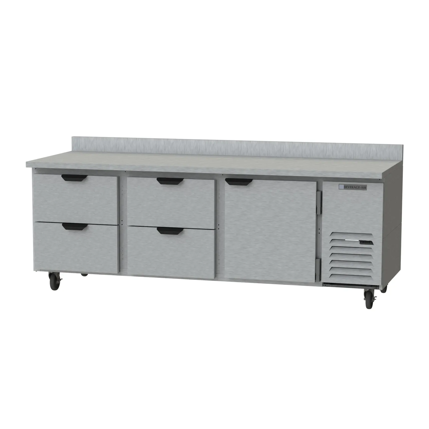 Introducing the Beverage Air WTRD93AHC-4 Refrigerated Counter, Work Top - the perfect solution to simplify restaurant operations. With its three-section design and 35-1/2" working height, this worktop refrigerator offers ample space for all your refrigeration needs. The 93"W unit features four drawers and one door, along with two shelves, providing convenient storage options for your ingredients and supplies. Its stainless steel exterior and top, along with the aluminum interior, ensure durability and easy cleaning, while the rear splash adds an extra layer of protection. The side-mounted self-contained refrigeration system, powered by a 1/3 HP motor and R290 Hydrocarbon refrigerant, guarantees efficient cooling performance. This unit is cULus and UL-Sanitation listed, making it a reliable and safe choice for any commercial restaurant. Simplify your operations and elevate your kitchen efficiency with the Beverage Air WTRD93AHC-4 Refrigerated Counter, Work Top. Made in the USA, this unit is built to last and deliver exceptional performance.