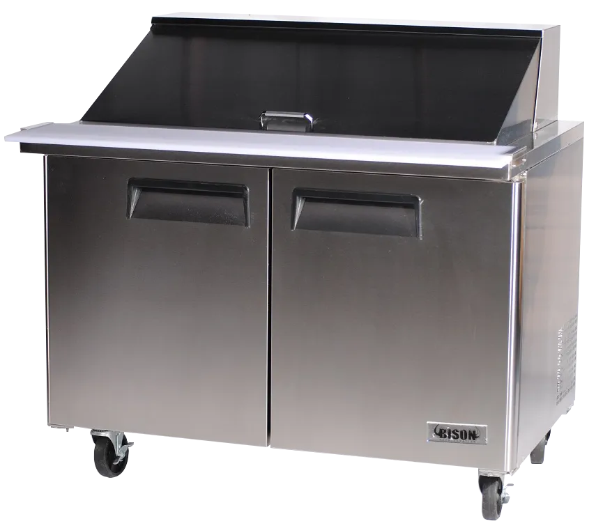 Achieve peak performance using the Bison Refrigeration Mega Top Sandwich Unit. Designed specifically for the demanding environment of a busy restaurant, this two-section unit offers a generous 14.7 cu. ft. capacity, ensuring ample space for all your sandwich prep needs. The rear-mounted self-contained refrigeration system keeps your ingredients at the perfect temperature, while the self-closing stainless steel door ensures energy efficiency and convenience.