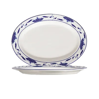 Transform spaces with innovation using the CAC China, 103-14, Platter, China. This versatile platter is designed to elevate your restaurant's presentation and functionality. Crafted from durable porcelain, it features a unique Blue Lotus design that adds a touch of elegance to any table setting. The oval shape and rolled edge provide a secure grip, making it easy to serve and handle. With dimensions of 12-1/4"L x 8-3/4"W x 1-1/4"H, this platter offers ample space to showcase your culinary creations. It is dishwasher, oven, and microwave safe, ensuring convenience and efficiency in a busy commercial kitchen. Whether you're serving appetizers, main courses, or desserts, this Blue Lotus platter is a must-have for any restaurant looking to impress guests with both style and functionality.