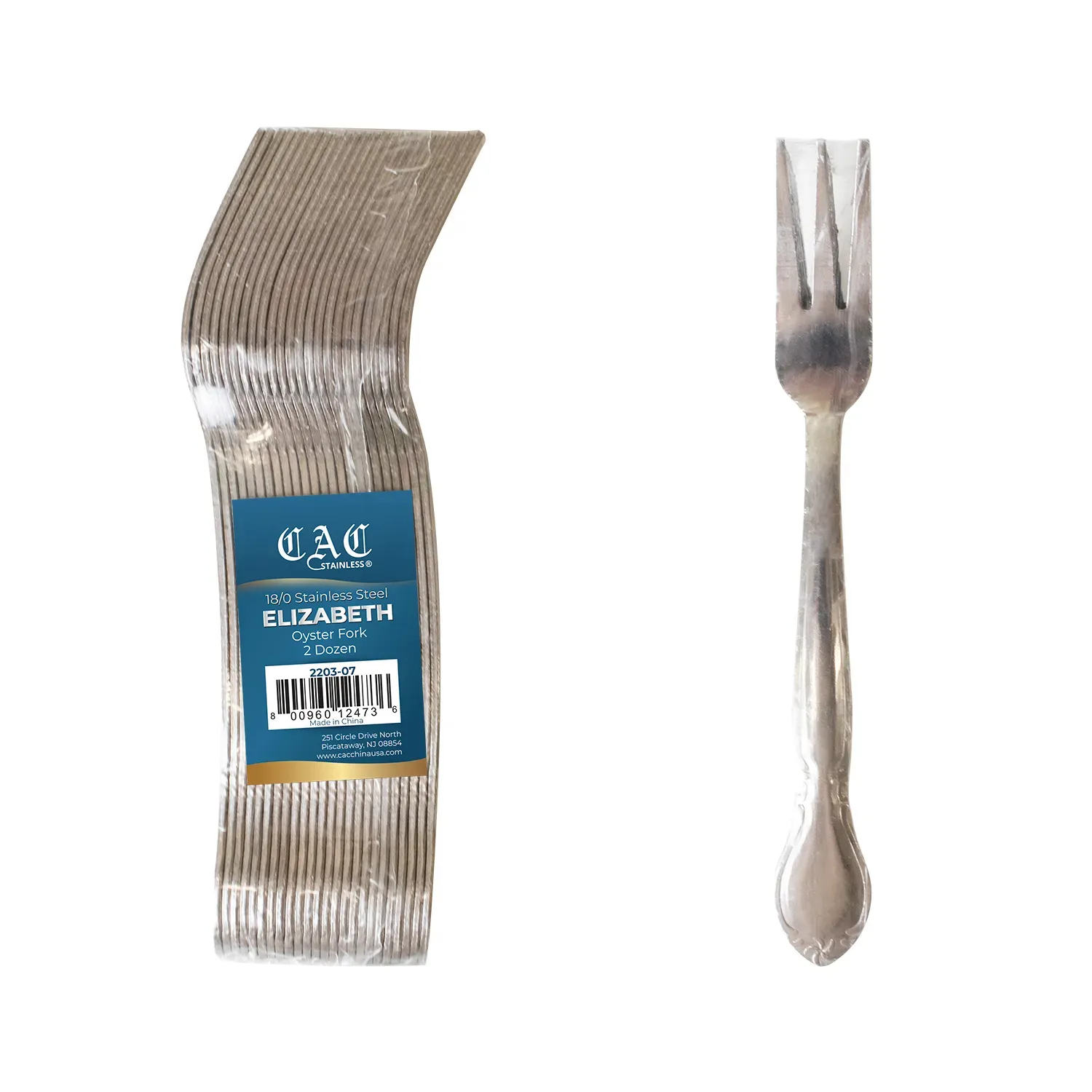 Elevate your dining experience with the exquisite Elizabeth CPK Oyster Fork, expertly crafted to combine elegance and functionality in one stunning piece. This 6-inch utensil is meticulously designed for the discerning seafood lover, featuring a chic frost finish that radiates sophistication and class. Made from high-quality 18/0 heavy-weight stainless steel, this oyster fork promises durability and a comfortable grip, ensuring it stands the test of time even with regular use. Its specialized prongs make it the perfect tool for effortlessly enjoying oysters and other shellfish, allowing you to savor every bite with grace and ease. Whether you're hosting a lavish dinner party or enjoying a quiet meal at home, this oyster fork adds a touch of luxury to any table setting. Its sleek design complements both traditional and contemporary dinnerware, making it an essential addition to your cutlery collection. Embrace the art of fine dining with the Elizabeth CPK Oyster Fork and experience the perfect blend of style and practicality that transforms your culinary adventures into unforgettable moments.