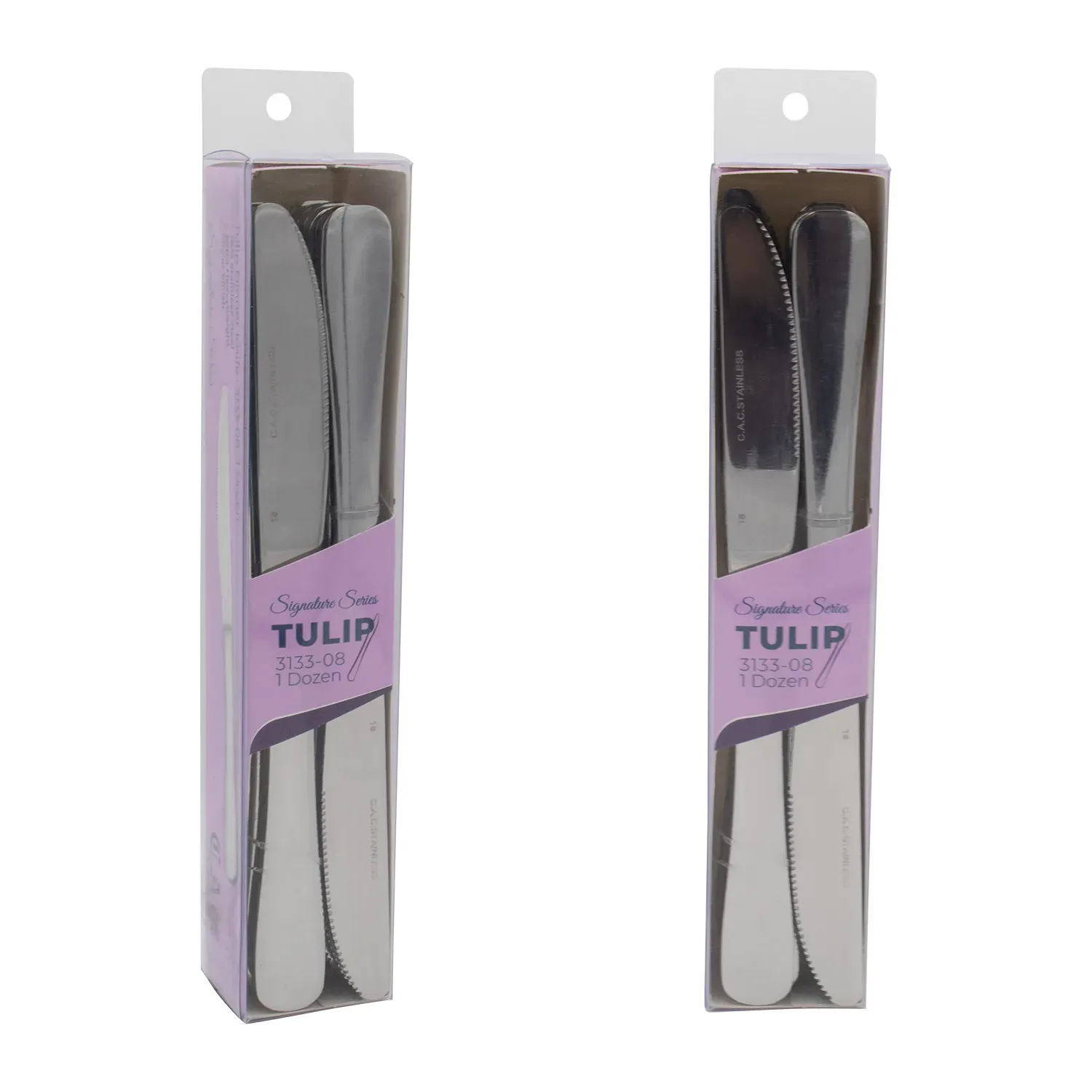 Elevate your dining experience with the Tulip CPK Dinner Knife, an exquisite blend of elegance and functionality, crafted to perfection for the discerning host. This dinner knife is made from high-quality 18/0 stainless steel, ensuring durability and resistance to rust, making it an ideal addition to any cutlery collection. With its Xtra heavy weight, the knife offers a balanced feel, providing a comfortable grip and effortless handling for a premium dining experience. Measuring at 9-1/8 inches, this knife is designed to seamlessly complement both casual and formal table settings. The sleek, polished finish and contemporary tulip-inspired design add a touch of sophistication, making it a standout piece on any dining table. Whether you're hosting a dinner party or enjoying a quiet meal at home, the Tulip CPK Dinner Knife combines style and practicality to enhance every bite. Its impeccable craftsmanship and refined aesthetic make it a must-have for those who value quality and elegance in their dining utensils. Explore the perfect harmony of form and function with this exceptional dinner knife, and delight in a culinary experience that resonates with luxury and taste.