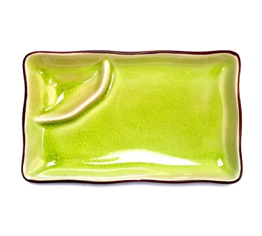 Introducing the CAC China 666-77-G Plate/Platter, Compartment, China. Ensure precision in cooking with this Japanese-style plate, designed specifically for commercial restaurant use. Crafted from durable stoneware with a reactive glaze, this plate is dishwasher, oven, and microwave safe, making it perfect for busy kitchen environments. Its rectangular shape and sauce compartment allow for elegant plating and easy serving of various dishes. The 8"L x 4"W x 1-1/4"H size provides ample space for culinary creations, while the Golden Green color adds a touch of sophistication to any table setting. Elevate your dining experience with the CAC China 666-77-G Plate/Platter, Compartment, China.