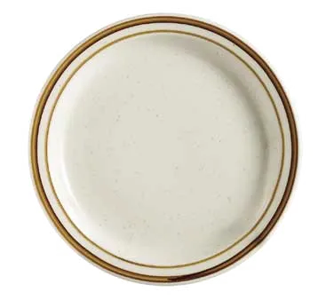 Upgrade your commercial restaurant with the CAC China AZ-9 Plate. This round, narrow rim plate is designed to meet modern demands, making it the perfect addition to any restaurant setting. Crafted from durable stoneware, this plate is dishwasher, oven, and microwave safe, ensuring convenience and versatility in a busy kitchen. The brown rim and brown speckled design add a touch of elegance to your table presentation, while the American white color complements any culinary creation. With a diameter of 9-3/4" and a height of 1", this plate provides ample space for your delicious dishes. Elevate your dining experience with the CAC China AZ-9 Plate and impress your customers with its quality and style.