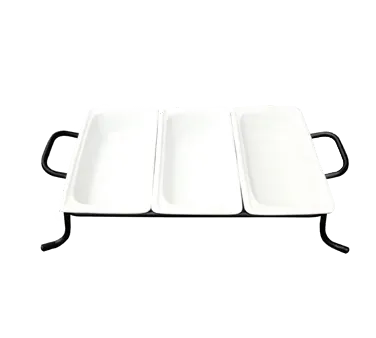 Transform spaces with innovation using the CAC China BF-G313 Food Pan. This high-quality porcelain food pan set is designed to meet the demands of a commercial restaurant setting. The set includes three 1/3 size food pans, each measuring 12-3/4"L x 6-7/8"W x 2-1/2"H, providing ample space for storing and serving a variety of dishes. The rectangular shape and sturdy construction make these pans dishwasher, oven, and microwave safe, ensuring convenience and versatility in the kitchen. The set also includes a rectangular rack with dividers bars and handles, allowing for easy transportation and organization. With its super white finish, this food pan set adds a touch of elegance to any restaurant decor. Trust CAC China, a reputable vendor in the industry, to deliver durable and functional products that enhance your restaurant's efficiency and presentation.