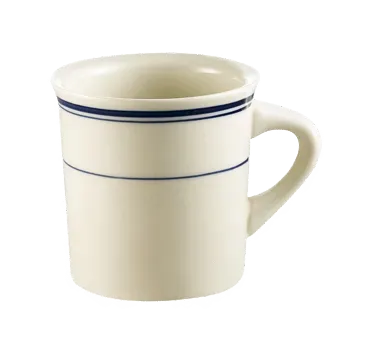 Seamless food preparation begins with the CAC China, BLU-38, Mug, China. This versatile mug is a must-have for any commercial restaurant. With its 8 oz. capacity and 3-3/8" diameter, it is perfect for serving hot beverages like coffee, tea, or hot chocolate. The round shape and sturdy stoneware construction ensure durability and longevity, making it suitable for everyday use in a busy restaurant environment. The dishwasher, oven, and microwave-safe design provide convenience and flexibility in food preparation and service. The blue band detail adds a touch of elegance to the classic American white finish, making it a stylish addition to any table setting. Elevate your dining experience with the CAC China, BLU-38, Mug, China.