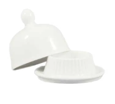 Experience quality dining with the CAC China, BUT-1, Butter Dish. This gourmet collection butter dish set is perfect for commercial restaurant use. It includes a round butter dish measuring 3-1/2" in diameter and 3" in height, as well as a dome-shaped lid. Made of durable porcelain, this butter dish is dishwasher, oven, and microwave safe, ensuring convenience and versatility in a busy restaurant kitchen. The super white color adds a touch of elegance to any table setting. With its 1 oz. capacity, this butter dish is ideal for serving individual portions of butter to your customers. Whether you're running a fine dining establishment or a casual eatery, this butter dish will enhance the presentation of your dishes and elevate the overall dining experience. Trust CAC China for high-quality, reliable restaurant supplies.
