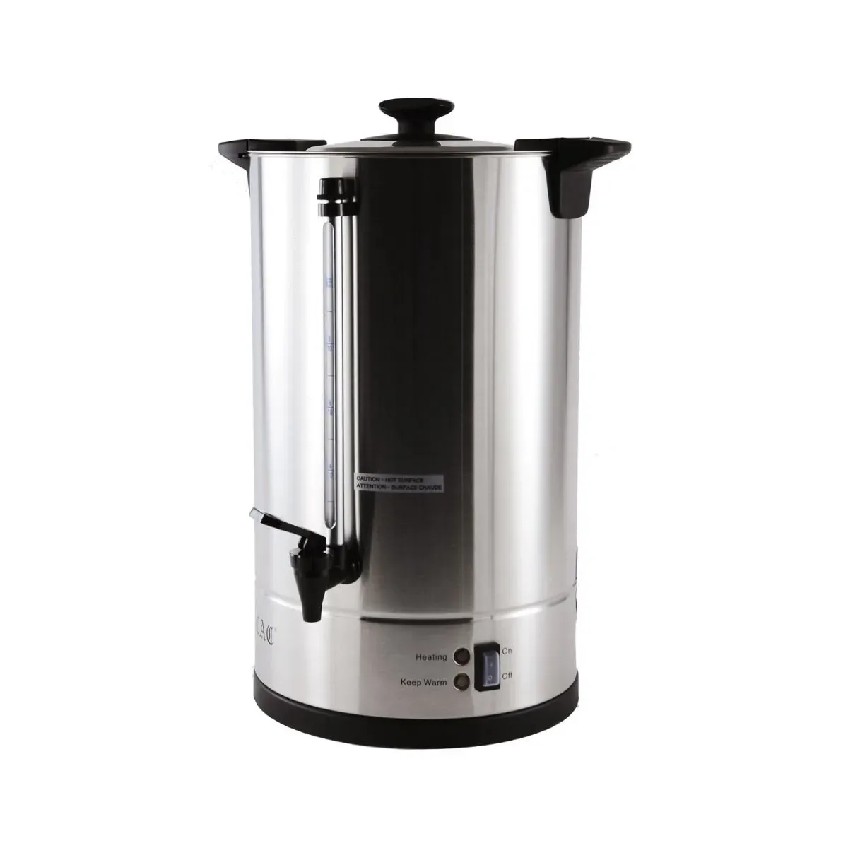 Constructed with a 304 stainless steel percolator pipe and filter basket, this urn coffee maker is both durable and energy-efficient, operating at a 1.5kW power rating. It is designed for a 110-120v/60/1-ph electrical supply and comes with a NEMA 5-15P plug. Safety is prioritized with boil-dry prevention control, and the unit is cETLus and CE certified, ensuring compliance with industry standards.