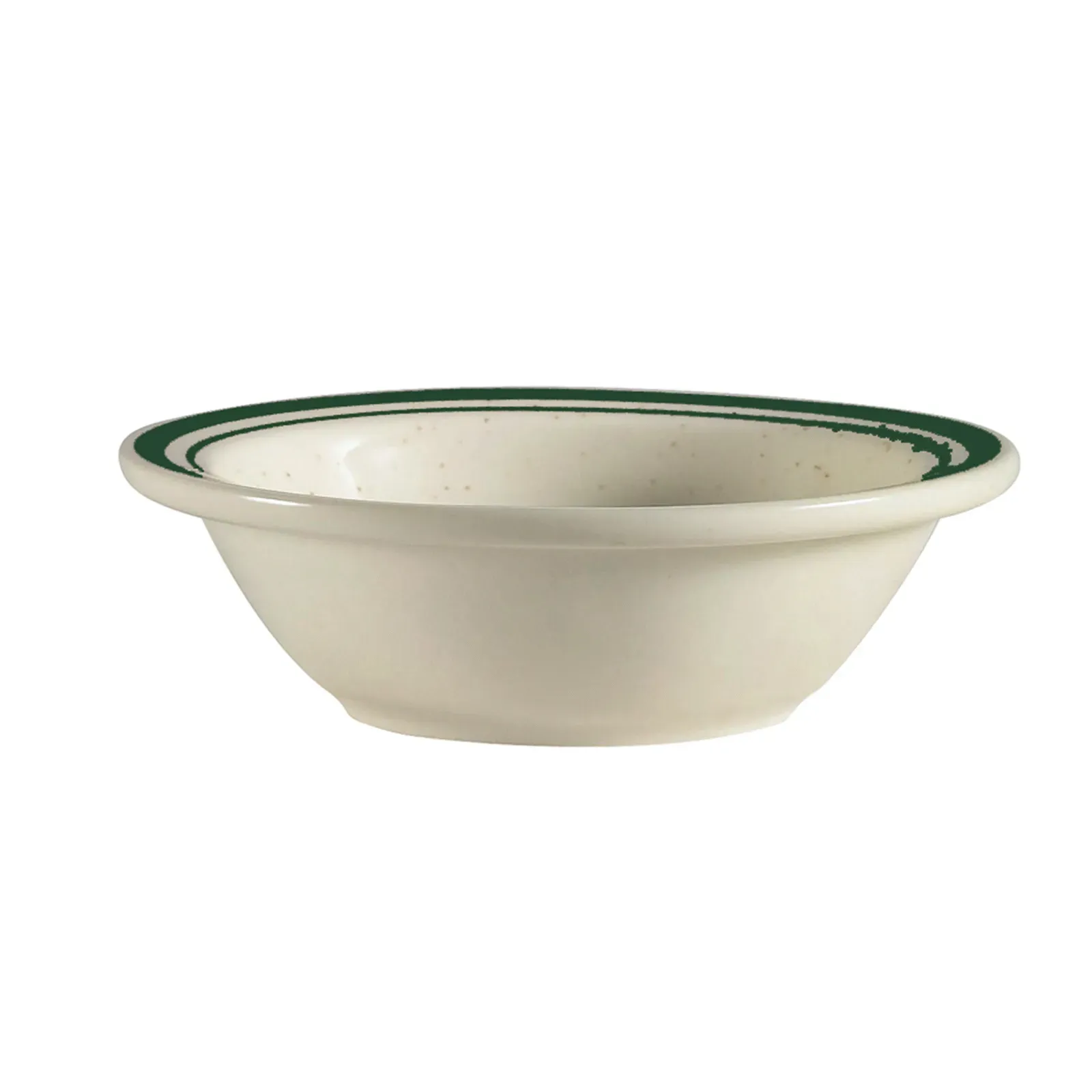 Elevate culinary experiences with the CAC China CES-11 Emerald Fruit Dish. This stunning dish is perfect for commercial restaurant use, adding a touch of elegance to any table setting. Crafted from durable stoneware, this dish is dishwasher, oven, and microwave safe, ensuring convenience and versatility in a busy kitchen. The narrow rim design and 5 oz. capacity make it ideal for serving individual portions of fruits, desserts, or appetizers. The emerald rim and speckled finish add a unique and eye-catching element to your presentation, while the American white base provides a classic and timeless appeal. Trust CAC China, a reputable vendor known for their high-quality products, to enhance your dining experience.