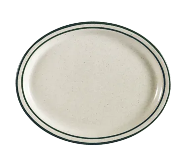 Enhance tabletop aesthetics with the CAC China CES-12 Platter. This stunning platter from CAC China is perfect for commercial restaurant use, adding a touch of elegance to any dining experience. Crafted from durable stoneware, this oval platter features a narrow rim design, making it ideal for showcasing appetizers, entrees, or desserts. The emerald rim and speckled design add a pop of color to your presentation, while the American white base provides a classic and versatile backdrop. With dimensions of 9-1/2"L x 7-1/4"W x 3/4"H, this platter offers ample space for your culinary creations. It is dishwasher, oven, and microwave safe, ensuring easy cleaning and versatility in the kitchen.