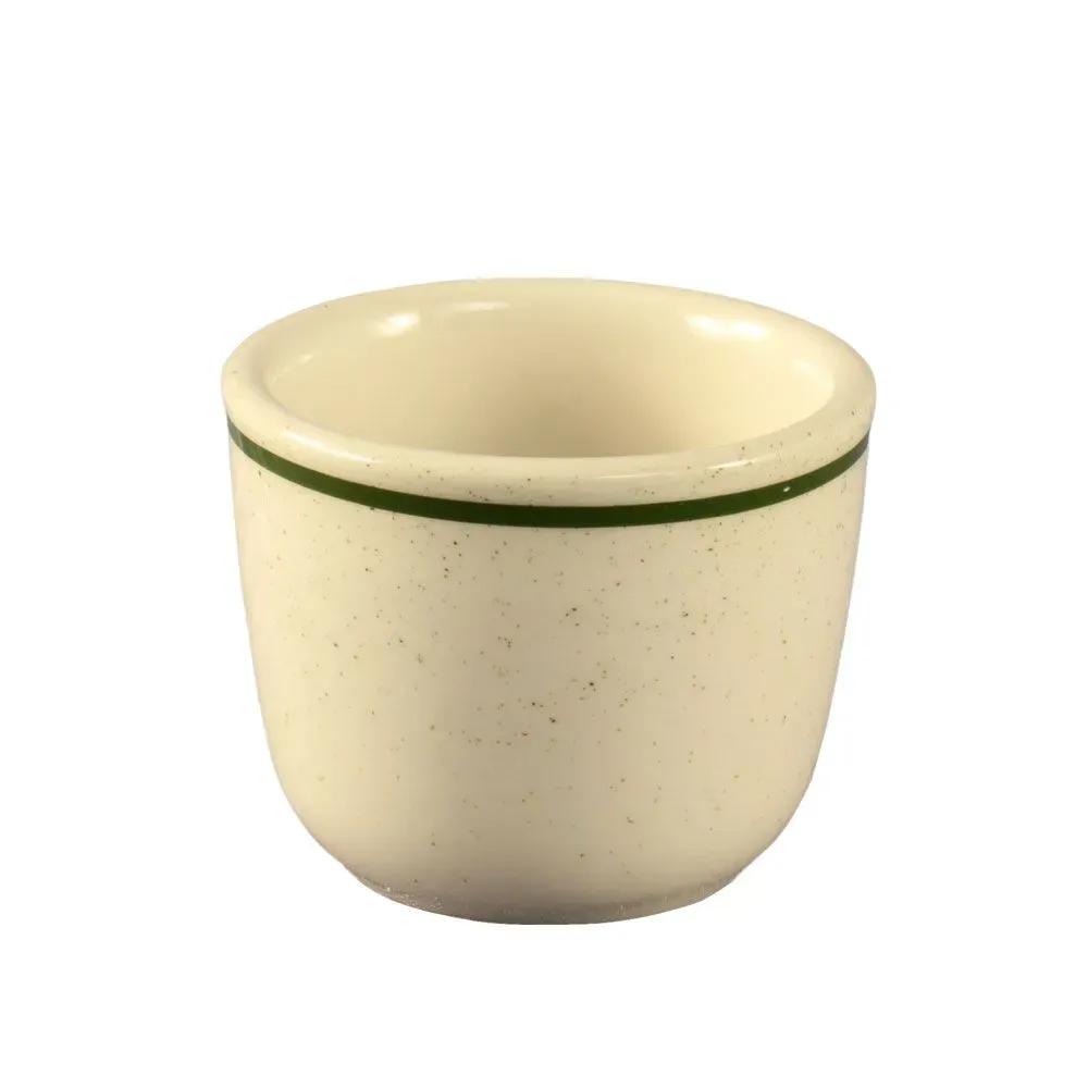 Crafted from durable stoneware, this ceramic tea cup features an eye-catching emerald rim and speckled pattern against an American white background, adding a touch of sophistication to your table settings. The unhandled design offers a traditional feel, while its dishwasher, oven, and microwave-safe properties ensure practicality and ease of use in a busy restaurant environment.