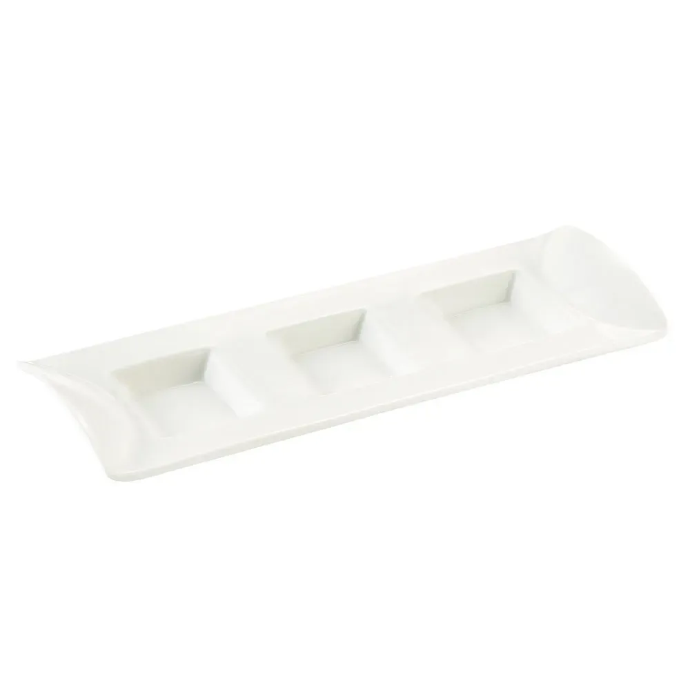 Transform spaces with innovation using the CAC China CN-3T10 Tray. This rectangular compartment tray is designed to enhance efficiency and organization in commercial restaurant settings. With three compartments, each capable of holding 1/2 oz., this tray allows for easy portioning and serving of various food items. Made of durable porcelain, it is dishwasher, oven, and microwave safe, ensuring convenience and versatility in the kitchen. The Super White color adds a touch of elegance to any table setting, making it perfect for upscale dining establishments. Whether you're serving appetizers, condiments, or small desserts, the CAC China CN-3T10 Tray is the ideal choice for streamlining your restaurant operations.