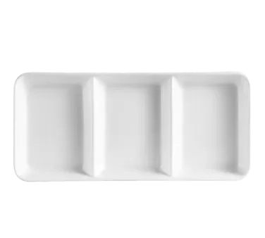 Enhance tabletop aesthetics with the CAC China CN-3T13 China Compartment Dish Bowl. This rectangular porcelain dish is designed for commercial restaurant use, offering both style and functionality. With three compartments, each holding 6 oz., this dish allows for easy organization and presentation of various side dishes. The Super White color adds a touch of elegance to any table setting, while the dishwasher, oven, and microwave-safe construction ensures convenience and durability. Whether you're serving appetizers, condiments, or small portions, this dish is perfect for showcasing your culinary creations. Trust CAC China for quality and style in your commercial kitchen.