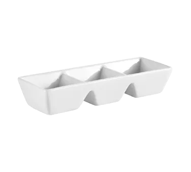 Experience the difference with the CAC China CN-3T7 China Compartment Dish Bowl. This rectangular porcelain dish is designed for commercial restaurant use, offering convenience and versatility. With three compartments, each holding 1-1/2 oz., this dish is perfect for serving a variety of side dishes, sauces, or condiments. Its 7"L x 2-1/2"W x 1-1/4"H size makes it ideal for individual portions, ensuring portion control and minimizing waste. The Super White color adds a touch of elegance to any table setting, while the dishwasher, oven, and microwave-safe construction make it easy to clean and heat food quickly. Upgrade your restaurant's presentation and efficiency with the CAC China CN-3T7 China Compartment Dish Bowl.