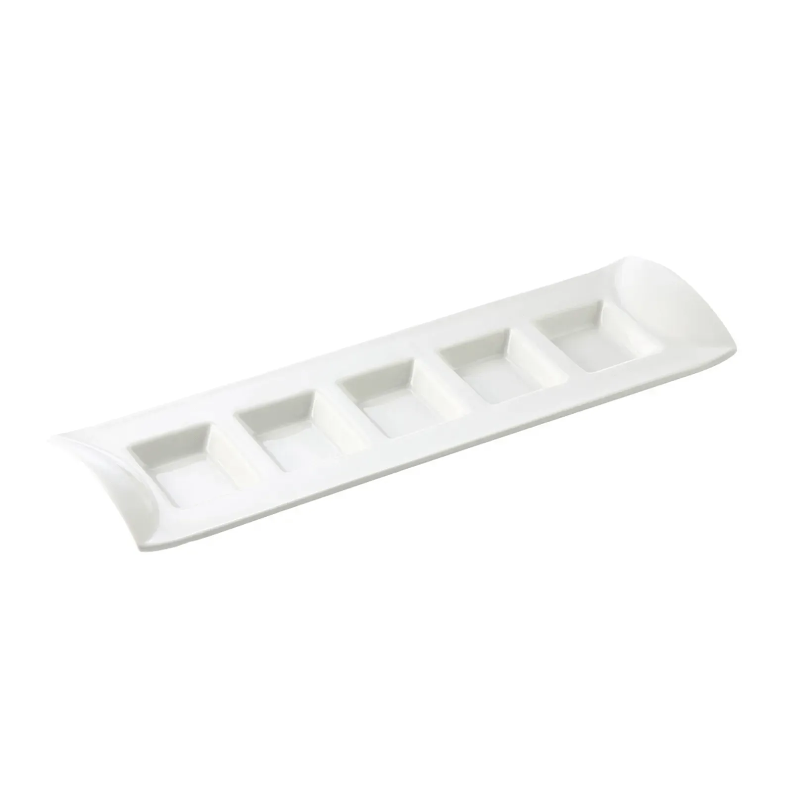 Create a seamless experience with the CAC China, CN-5T13 Tray, Compartment, China. This rectangular compartment tray is designed for commercial restaurant use, offering convenience and efficiency. With five compartments, each holding 1/2 oz., this tray allows for organized and portioned food presentation. Made of durable porcelain, it is dishwasher, oven, and microwave safe, ensuring easy cleaning and versatility in food preparation. The 13"L x 3-7/8"W x 1-3/8"H size provides ample space for various culinary creations. The Super White color adds a touch of elegance to any table setting. Whether you're serving appetizers, condiments, or small bites, the CAC China, CN-5T13 Tray, Compartment, China is the perfect addition to your restaurant's tableware collection.
