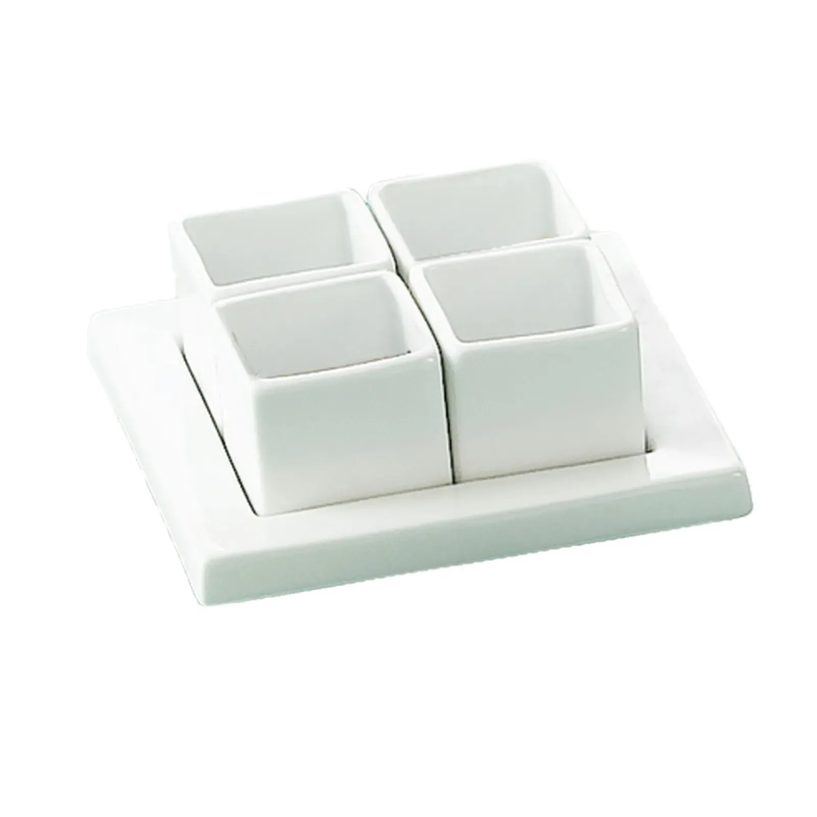 Introducing the CAC China DT-SQ5 Bowl Set, a premium tool for a successful setup in your commercial restaurant. This Gourmet Collection Tray and Bowl Set is designed to elevate your dining experience. The set includes four square bowls, each with a capacity of 2-1/2 oz. and dimensions of 2" dia x 2-1/2"H, perfect for serving individual portions of appetizers or desserts. The set also features a square tray measuring 5-3/4"L x 5-3/4"W x 1"H, providing a stylish and convenient way to present your culinary creations. Made of durable porcelain, this set is dishwasher, oven, and microwave safe, ensuring easy cleaning and versatility in the kitchen. With its Super White finish, this bowl set adds a touch of elegance to any table setting. Trust CAC China, a renowned vendor in the industry, and invest in this high-quality bowl set to impress your customers and enhance your restaurant's image.