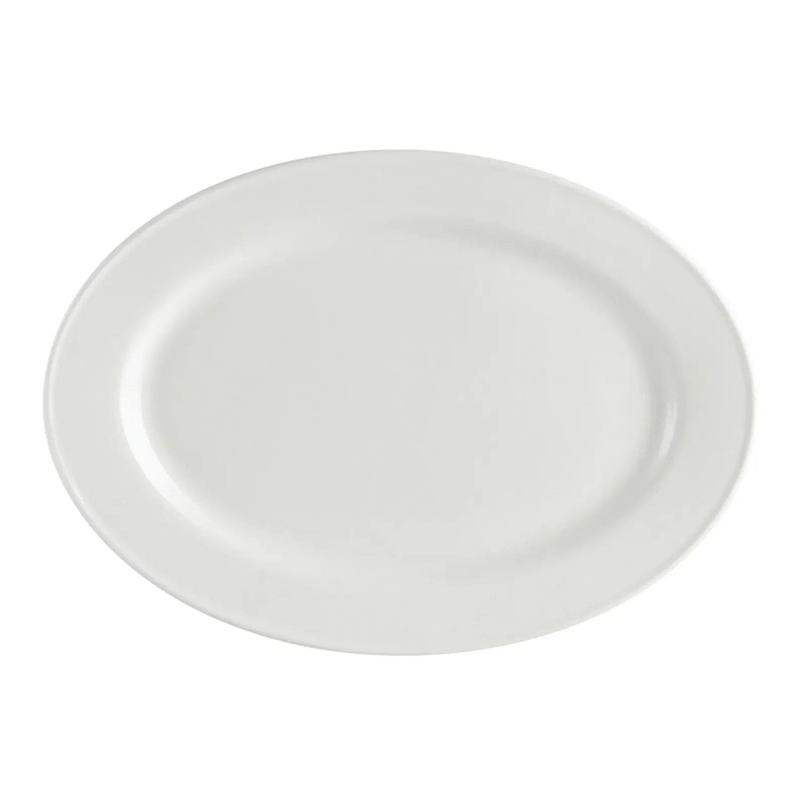Elevate restaurant standards with the CAC China EVT-13 Platter. This exquisite oval platter is designed to impress, making it the perfect addition to any commercial restaurant. Crafted with fully vitrified porcelain, it boasts a bone white finish that exudes elegance and sophistication. The glazed foot and bead edge add a touch of refinement, while ensuring durability and longevity. With dimensions of 11-3/4"L x 8-1/4"W x 3/4"H, this platter provides ample space to showcase your culinary creations. It is dishwasher, oven, and microwave safe, offering convenience and versatility in a busy restaurant environment. Trust CAC China, a reputable vendor known for their high-quality china, to deliver exceptional products that enhance your restaurant's aesthetic and elevate your dining experience.