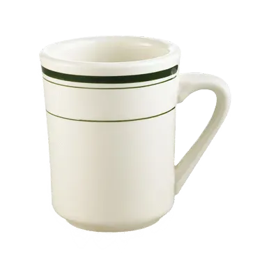Elevate culinary experiences with the CAC China GS-17 Mug. This authentic stoneware mug is perfect for commercial restaurant use, adding a touch of elegance to any table setting. With a capacity of 8 oz., it is ideal for serving hot beverages like coffee, tea, or hot chocolate. The tall, round design and green band detail give it a sophisticated look that will impress your customers. Made from durable ceramic, this mug is dishwasher, oven, and microwave safe, ensuring easy cleaning and versatility in the kitchen. Whether you're running a café, bistro, or fine dining restaurant, this mug is a must-have for serving beverages in style.