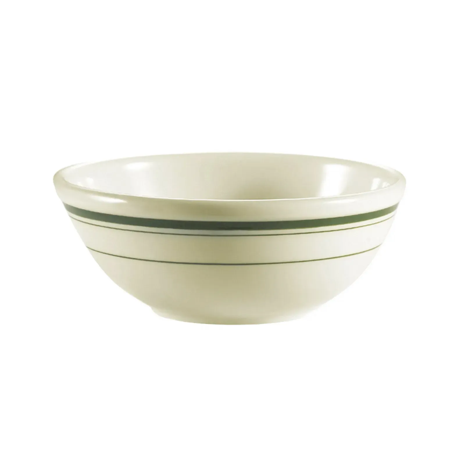 Introducing the CAC China GS-24 Greenbrier Nappie Bowl, a must-have addition to modernize your restaurant setup. This 10 oz. bowl is perfect for serving a variety of dishes, from soups and salads to pasta and desserts. Made of durable stoneware, this bowl features a rolled edge for added strength and a sleek design that will enhance the presentation of your culinary creations. The dishwasher, oven, and microwave-safe construction ensure easy cleaning and versatility in the kitchen. With its green band and American white color, this bowl adds a touch of elegance to any table setting. Whether you're running a bustling cafe or a fine dining establishment, the CAC China GS-24 Greenbrier Nappie Bowl is the ideal choice for serving your signature dishes with style and sophistication. Upgrade your restaurant's dinnerware collection today and impress your customers with this high-quality bowl.