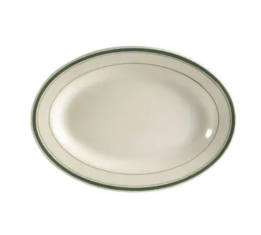 Elevate culinary experiences with the CAC China GS-33 Platter. This stunning oval platter is perfect for commercial restaurant use, adding a touch of elegance to any dish. Crafted from durable stoneware, this platter is dishwasher, oven, and microwave safe, ensuring convenience and versatility in a busy kitchen. The rolled edge design adds a stylish touch, while the green band and American white color scheme exudes sophistication. With dimensions of 7"L x 4-5/8"W x 1/2"H, this platter provides ample space for presenting appetizers, entrees, or desserts. Trust CAC China, a reputable vendor in the industry, to deliver high-quality products that enhance your restaurant's dining experience.