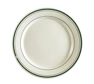 Modernize your restaurant setup with the CAC China GS-8 Plate. This high-quality stoneware plate is designed to elevate your dining experience. With a diameter of 9 inches and a height of 1 inch, it provides ample space for presenting your culinary creations. The rolled edge adds a touch of elegance, while the green band on an American white background adds a pop of color to your table setting.