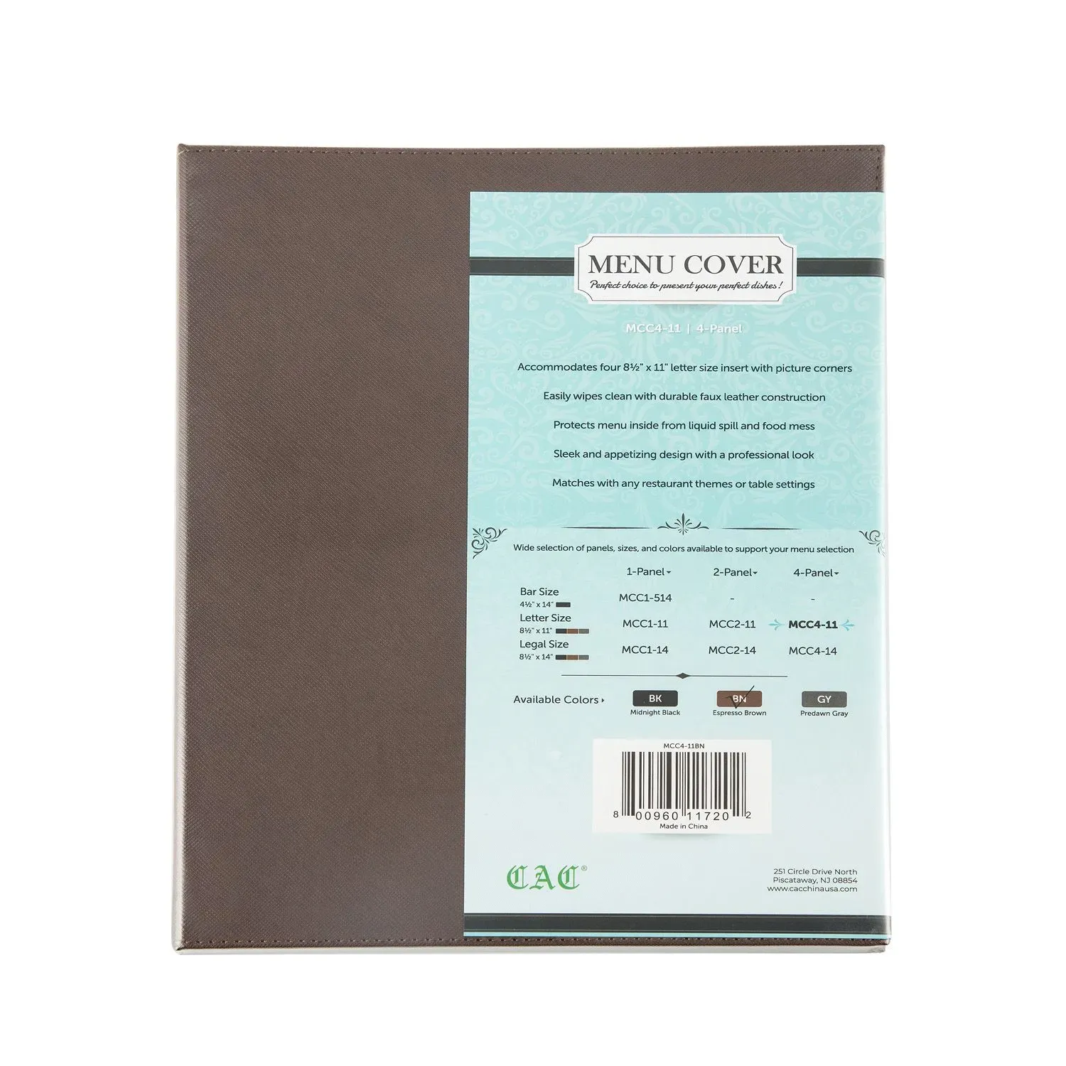 Designed with practicality in mind, the MCC4-11BN features a 4-panel layout, providing ample space to showcase your diverse menu offerings. Each panel accommodates standard 8-1/2 x 11" inserts, making it easy to update and organize your menu items as needed. The faux leather material not only enhances the aesthetic appeal but also ensures easy maintenance and longevity, standing up to the rigors of daily use in a bustling restaurant environment.