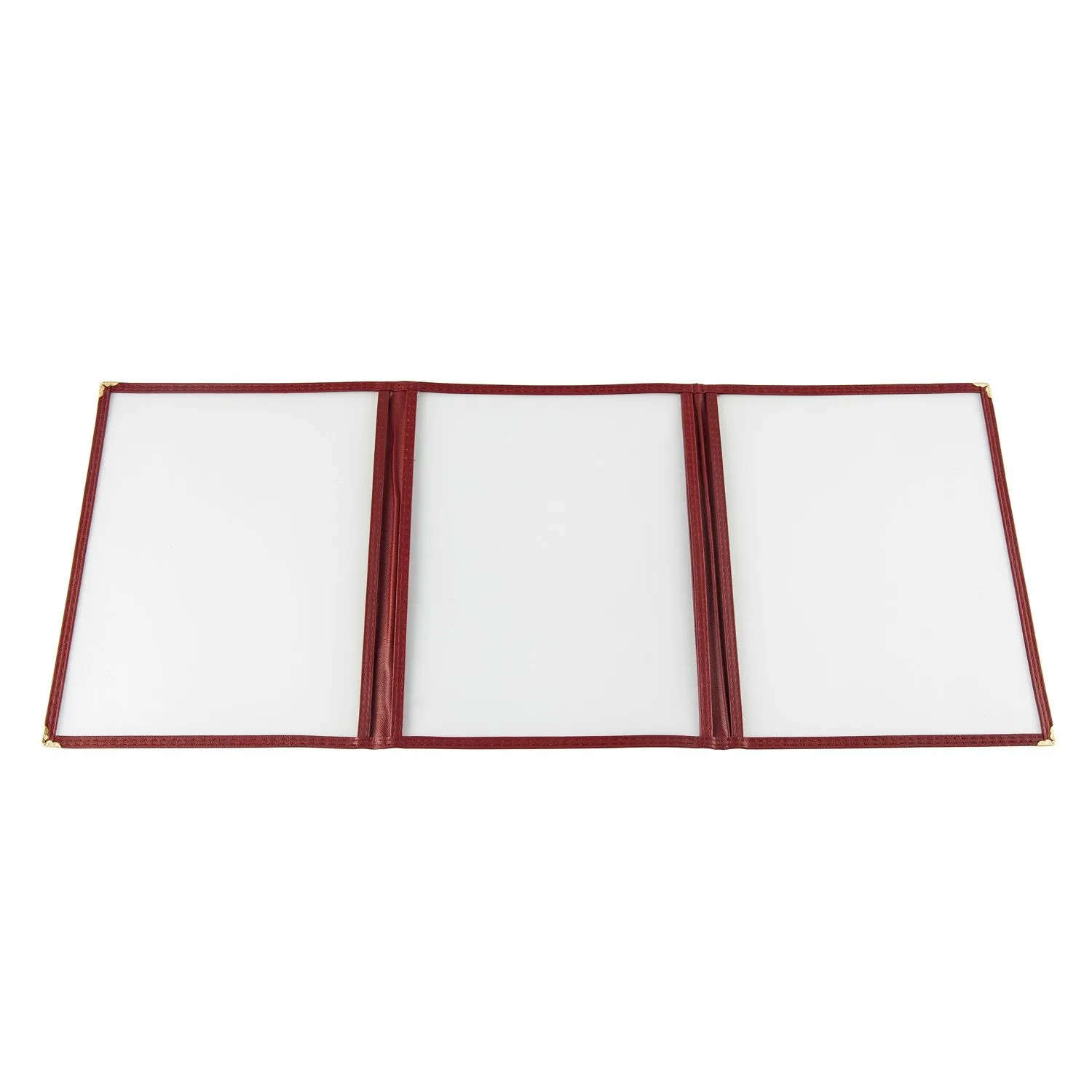A practical choice for busy kitchens requiring durable kitchenware, the Burgundy 3-Pocket Menu Cover is an essential addition to any restaurant setting. Designed to accommodate standard 8-1/2 x 11" menus, this elegant cover not only enhances the presentation of your menu offerings but also ensures they remain protected and pristine. The rich burgundy color adds a touch of sophistication, making it suitable for a variety of dining environments, from casual eateries to upscale establishments.
