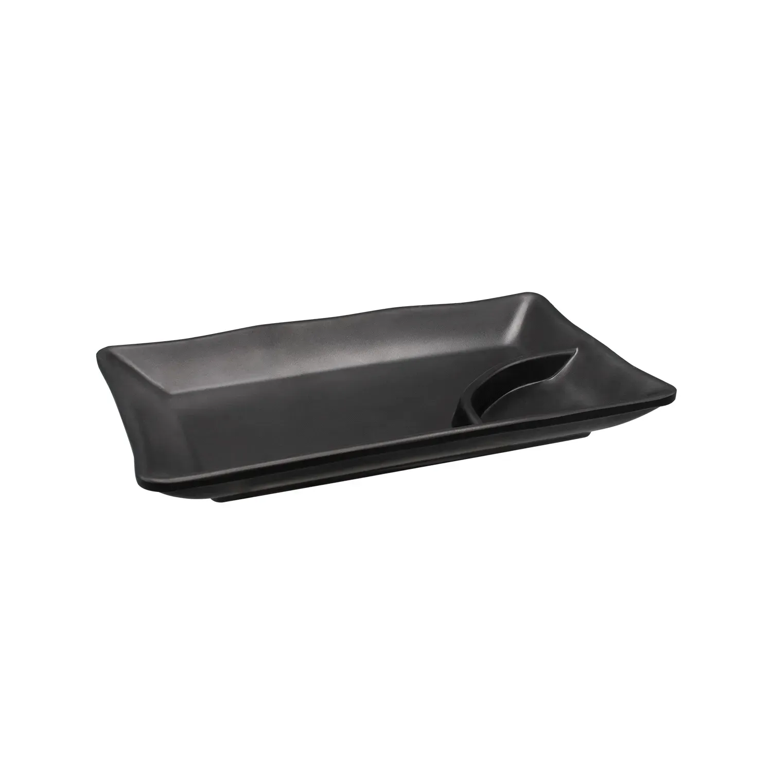 Elevate your dining experience with our sleek matte black platter, meticulously designed to combine sophistication and functionality. This rectangular platter, measuring 7-3/4 inches, features a distinctive triangular compartment, perfect for showcasing your culinary creations with flair. Its elegant matte black finish not only complements any table setting but also adds a touch of modern elegance to your presentation. With a generous 10-ounce main compartment and an additional 1-ounce section, this platter is ideal for serving a variety of dishes, from delectable appetizers to gourmet desserts, while keeping sauces or garnishes neatly separated. Crafted for the discerning host, this platter seamlessly merges style with practicality, making it a versatile addition to any kitchen or dining room. Whether you're hosting an intimate dinner party or a grand celebration, let this platter be the centerpiece of your table, impressing guests with both its aesthetic appeal and utility. Discover the perfect blend of contemporary design and culinary artistry, and transform the way you serve and savor your favorite dishes.