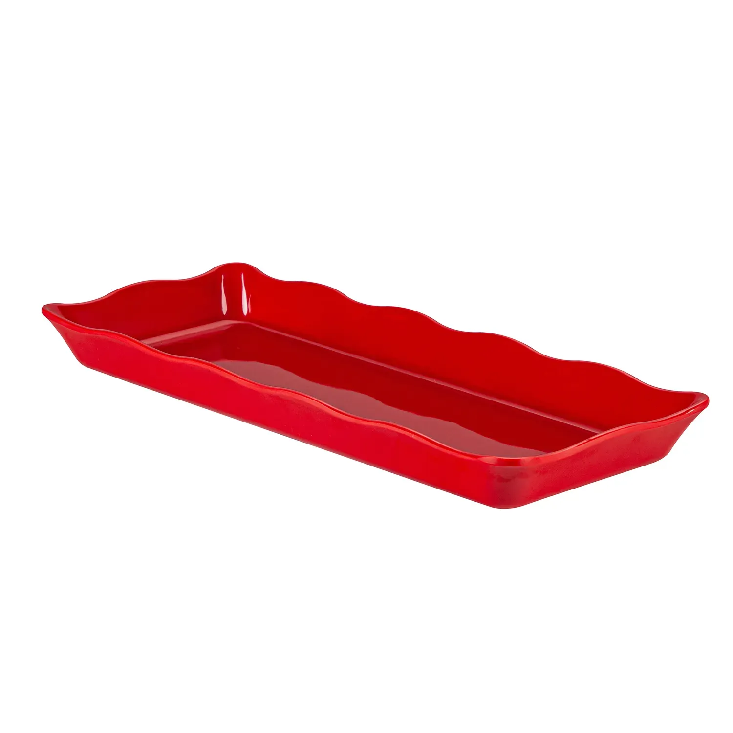 Elevate your dining experience with this exquisite rectangular platter, designed to captivate with its elegant scallop edge and vibrant red hue. Measuring 14 inches by 5-3/4 inches, this stunning serving piece is perfect for showcasing appetizers, desserts, or main courses with a touch of sophistication. Crafted for both style and functionality, this platter adds a pop of color to any table setting, making it an ideal choice for both casual gatherings and formal dinners. Its unique scallop edge not only enhances its visual appeal but also adds a layer of refinement that complements various culinary presentations. Made from high-quality materials, this platter ensures durability and ease of maintenance, allowing you to focus on creating memorable culinary moments. Whether you're hosting a festive holiday feast or an intimate dinner party, this platter seamlessly blends with your tableware, making it a versatile addition to your serveware collection. Impress your guests and transform your dining table into a masterpiece with this red scallop-edge platter, where style meets practicality in the most delightful way.