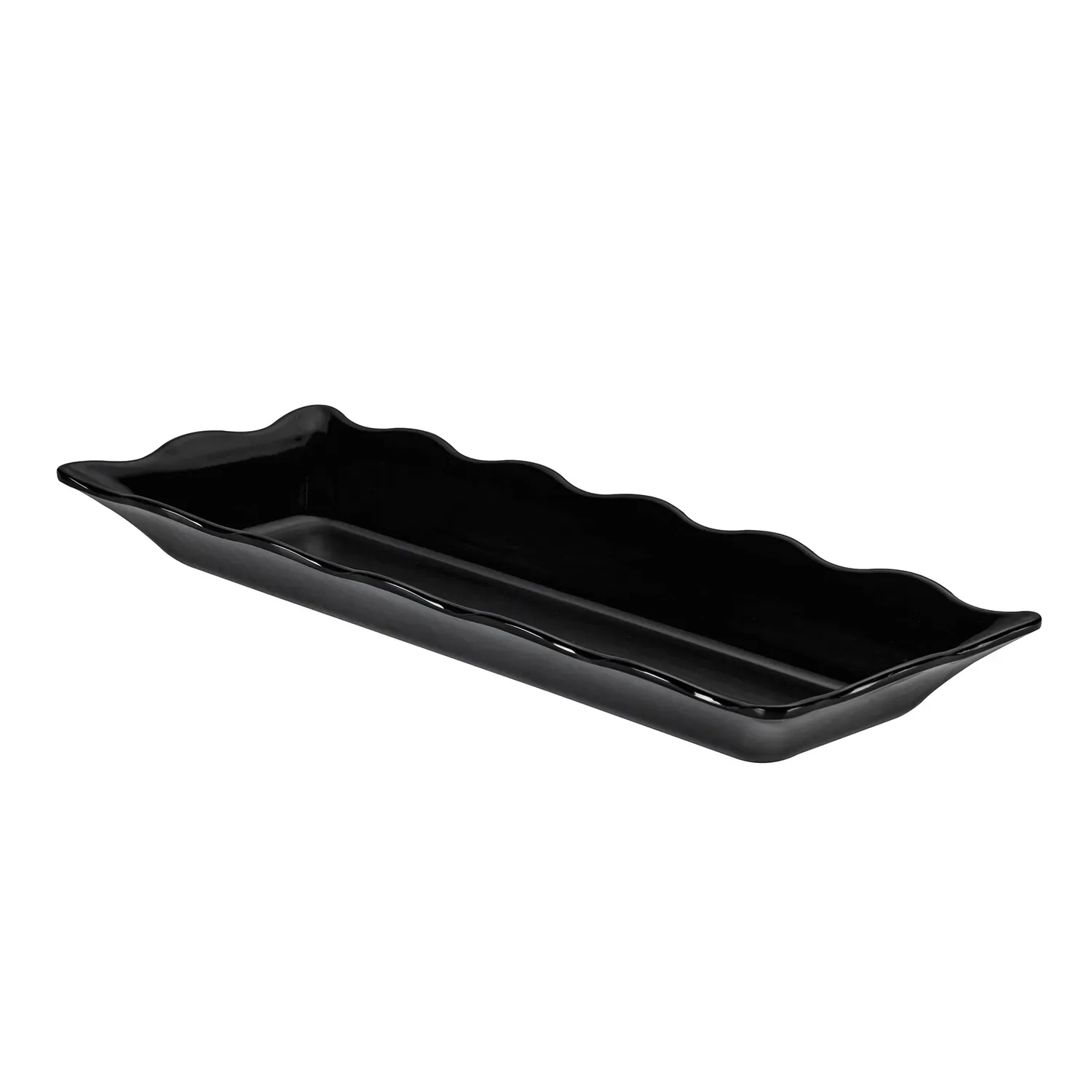 Elevate your dining presentation with this exquisite Rectangular Scallop Edge Black Platter, a striking addition to any table setting. Crafted to blend elegance with functionality, this platter measures an impressive 17-1/2"x6-3/4", offering ample space for showcasing your culinary creations. The sophisticated black hue provides a stunning contrast to vibrant foods, enhancing the visual appeal of your dishes. Its unique scallop-edged design adds a touch of refined artistry, making it perfect for both casual gatherings and formal events. Constructed with durability in mind, this platter is ideal for serving everything from appetizers and hors d'oeuvres to main courses and desserts. Its sleek and modern aesthetic seamlessly complements a wide range of tableware styles, ensuring it fits effortlessly into your existing collection. Whether you're a professional caterer or a home entertainer, this platter is designed to meet your high standards, offering both beauty and practicality. Embrace the art of presentation and make a lasting impression with this essential piece, perfect for elevating the everyday dining experience or adding a touch of class to special occasions.