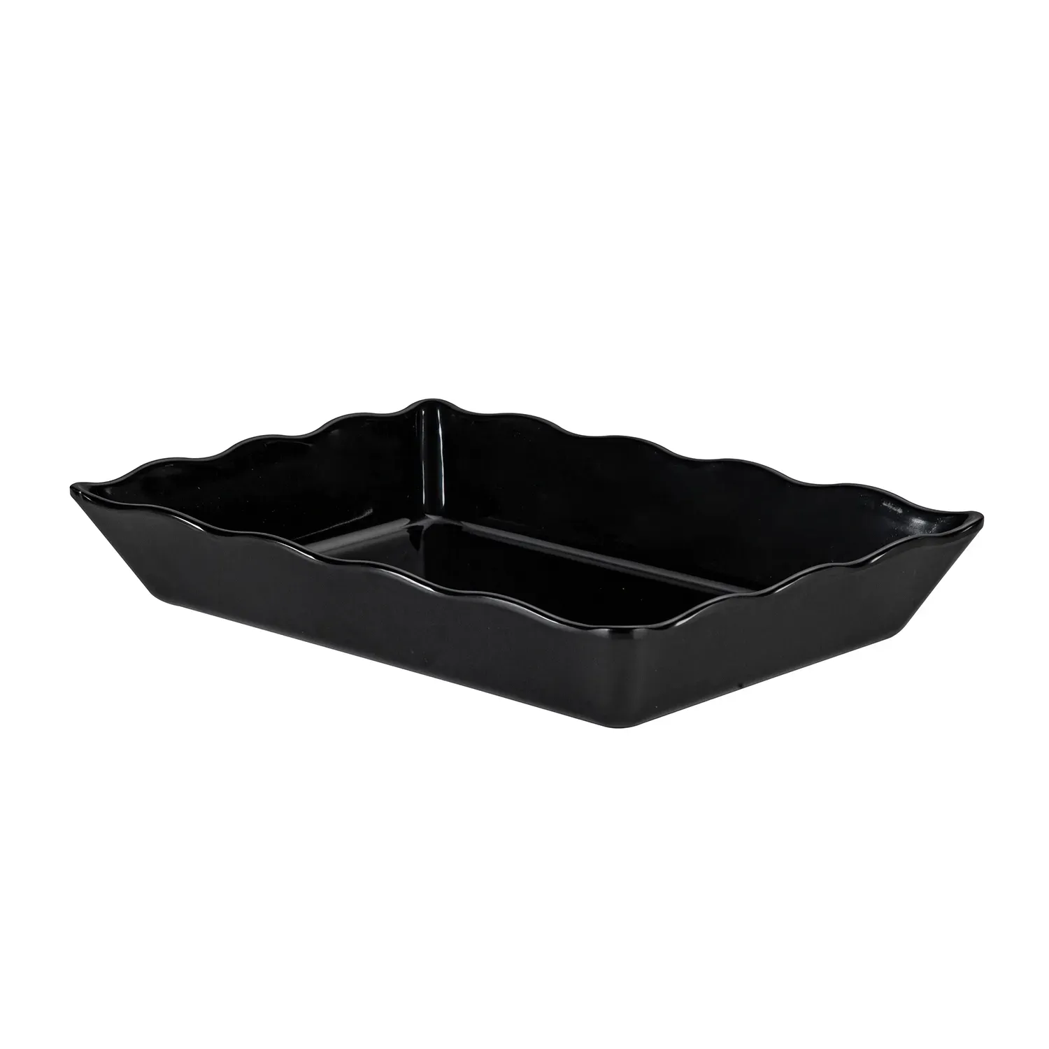 Elevate your dining experience with our elegant Rectangular Scallop Edge Black Platter, meticulously crafted to enhance your culinary presentation. Measuring a generous 13-3/4 inches by 9-1/2 inches, this platter offers ample space for showcasing a variety of dishes, from savory appetizers and delectable entrees to indulgent desserts. The striking black finish serves as the perfect backdrop, accentuating the vibrant colors and textures of your culinary creations. Its sophisticated scallop edge adds a touch of refinement, making it an ideal choice for both casual gatherings and formal occasions. Crafted from high-quality materials, this platter is not only visually stunning but also designed for durability and longevity, ensuring it remains a staple in your serveware collection for years to come. Whether you're a professional chef or a passionate home cook, this versatile platter will undoubtedly become a go-to piece in your hosting repertoire. Its sleek design seamlessly complements any table setting, while its practicality makes serving and cleaning effortless. Impress your guests with a presentation that exudes elegance and style, and let this exquisite platter be the centerpiece of your next dining experience.