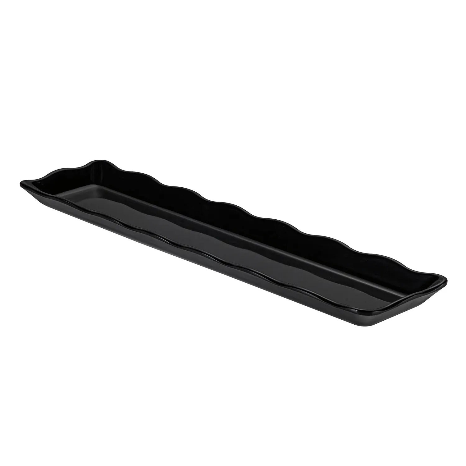 Elevate your dining experience with our exquisite Rectangular Scallop Edge Platter, a striking addition to any table setting. This elegant black platter, measuring 21 inches by 5-1/4 inches, combines sophistication and functionality, making it perfect for serving an array of culinary delights. Its unique scalloped edge adds a touch of artistic flair, setting it apart from conventional serving dishes and making it a conversation starter at any gathering. Crafted with precision, this platter is not only a visual masterpiece but also highly durable, ensuring it stands up to the demands of both everyday use and special occasions. Whether you're presenting a selection of appetizers, a charcuterie spread, or an array of desserts, this platter enhances the presentation, making your dishes look as delectable as they taste. Its sleek black finish provides a modern yet timeless appeal, seamlessly complementing any décor style. Ideal for both formal events and casual get-togethers, this platter is a must-have for hosts who appreciate the finer details in dining presentation. Discover the perfect blend of style and practicality with this stunning platter, designed to impress and built to last.