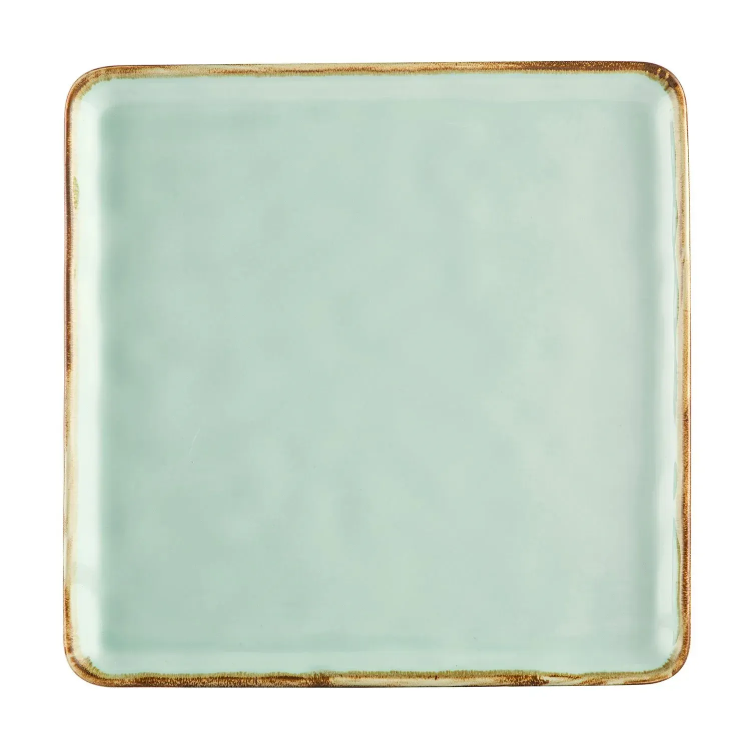 Enhance your dining experience with beautifully designed kitchenware options. Introducing the Palm Springs Square Plate, a stunning addition to any restaurant's table setting. Measuring 10 inches by 10 inches with a height of 1/2 inch, this square plate is crafted from high-quality porcelain, ensuring both durability and elegance. The reactive glaze finish in a soothing light green hue adds a touch of sophistication and uniqueness to each piece, making it perfect for showcasing your culinary creations.