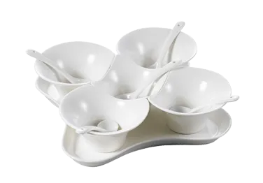 Introducing the CAC China PTB-11SET Bowl Set, designed to elevate your restaurant's reputation. This 11-piece set includes five 4 oz. Paris-French Champagne Condiment Bowls, measuring 4-3/8"L x 3-3/4"W x 2"H, perfect for serving individual portions of sauces or condiments. The set also features a tray measuring 8-3/4"L x 8-3/4"W x 3/4"H, providing a stylish and convenient way to present the bowls to your guests. Made of durable porcelain in a timeless Bone White color, these bowls and tray are dishwasher, oven, and microwave safe, ensuring easy cleaning and versatility in the kitchen. Each set comes with five spoons, completing the elegant presentation. Whether you're running a fine dining establishment or a casual eatery, the CAC China PTB-11SET Bowl Set is a must-have for enhancing the dining experience and impressing your customers.