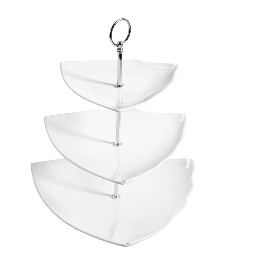 The TriServe features three distinct tiers: an 11-3/4" wide base tier, a 9" wide middle tier, and a 7-1/2" wide top tier, all standing at a total height of 13-1/2". Crafted from super white porcelain, this serving tray not only enhances the visual appeal of your culinary creations but also offers exceptional durability and versatility.
