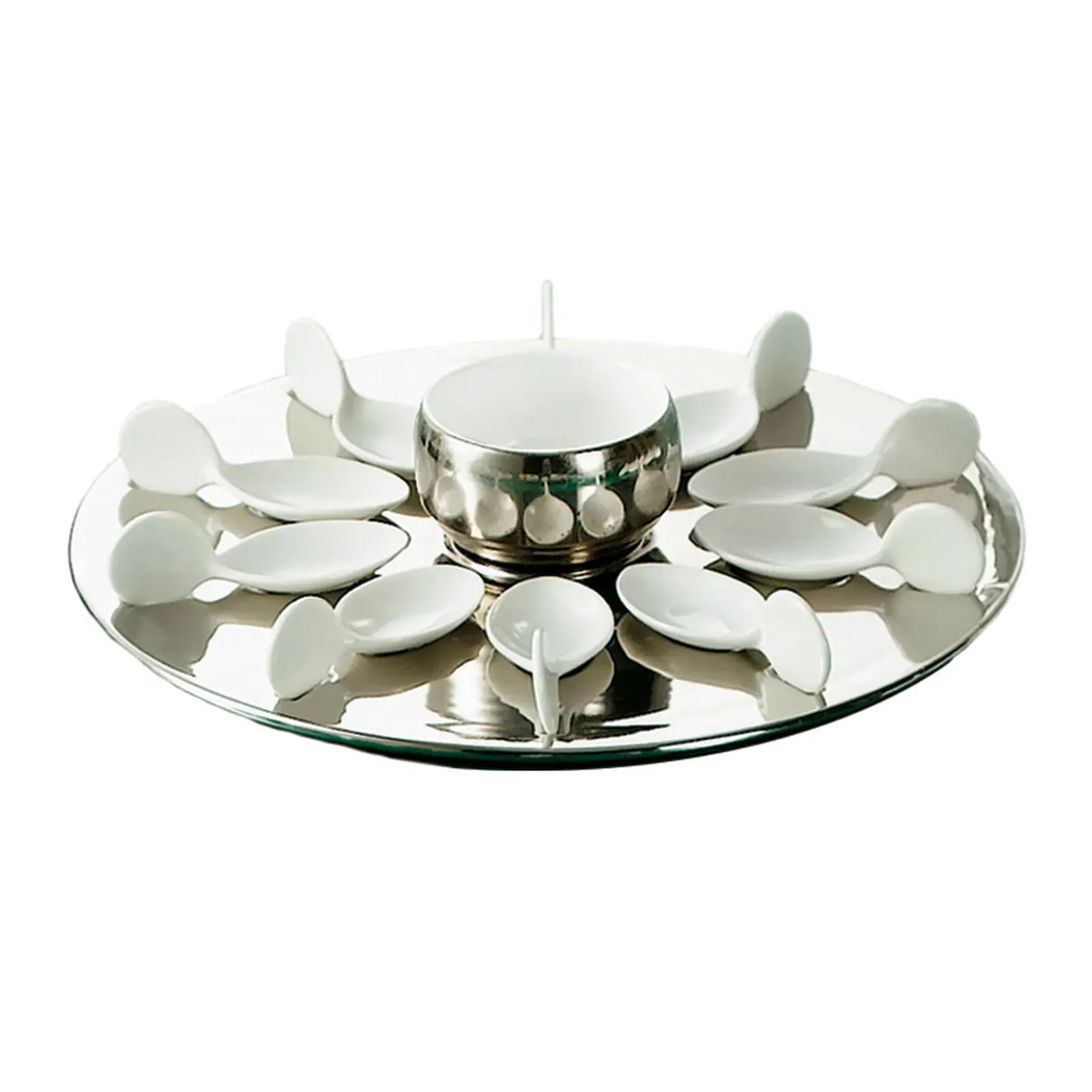 Introducing the CAC China PTP-21-SL Serving & Display Tray, Metal. Premium tools for a successful setup, this tray is a must-have for any commercial restaurant. Crafted by CAC China, a trusted vendor in the industry, this tray is designed to impress. The set includes 10 tasting spoons, a 7 oz. bowl, and a round tray, all made of durable and dishwasher-safe porcelain. With its sleek silver and super white color, this tray adds a touch of elegance to any table setting. Whether you're serving appetizers, desserts, or small bites, this tray is perfect for showcasing your culinary creations. Its microwave and oven-safe properties make it versatile for various cooking and heating needs. Elevate your restaurant's presentation with the CAC China PTP-21-SL Serving & Display Tray, Metal.